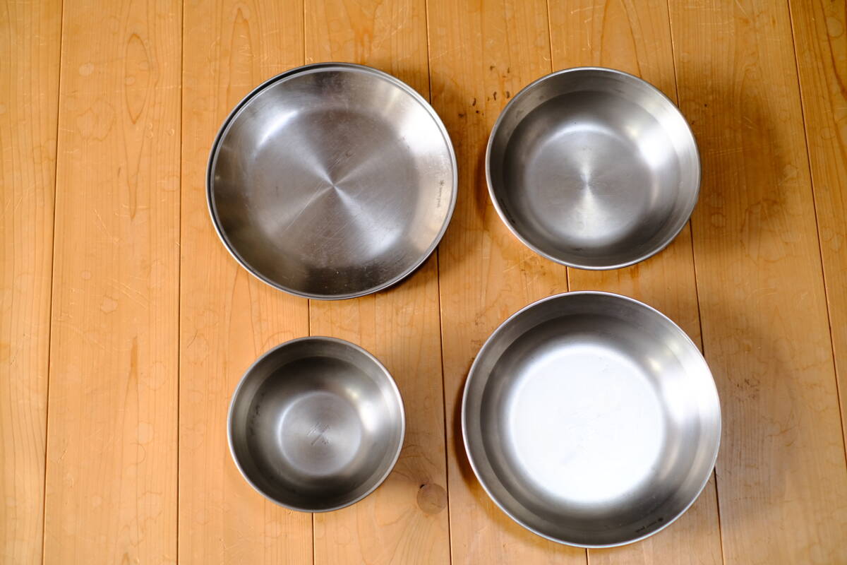 スノーピークのステンレスの皿4枚セットです。 薄く軽量なステンレス製のテーブルウェアディッシュ。 重ねてもかさばらずに収納や持ち運びができます 箱はありません。 緩衝材等での梱包になります。 キャンプで何度か使用し自宅保管しておりました。 細かな傷や使用感はありますが、歪み等なくまだまだ使って頂けます。