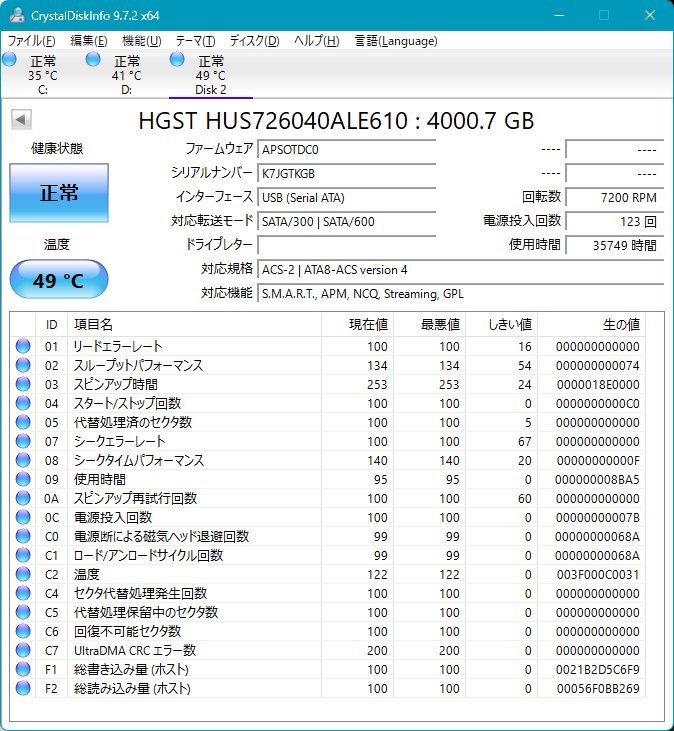 ご参考までにCrystal Disk Infoの結果を載せてます。