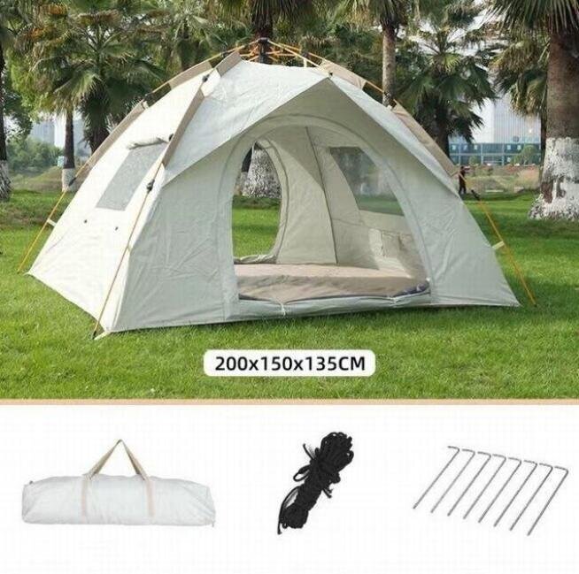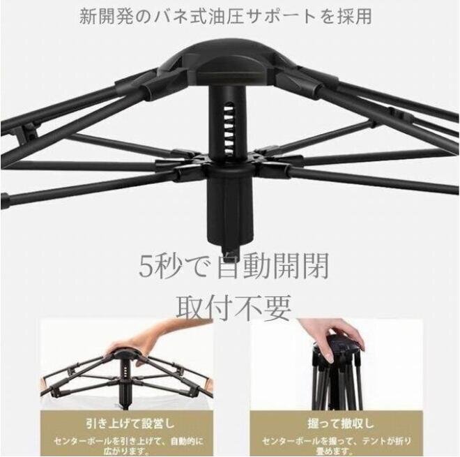 ワンタッチ式、一人でも5秒だけで簡単に設営できます、災害時の避難所などでも活躍します。製品はUVカット加工を採用しており、強い陽射しでも怖くないです。テント内側の紫外線対策はバッチリです。日差しからでも肌を守れます。