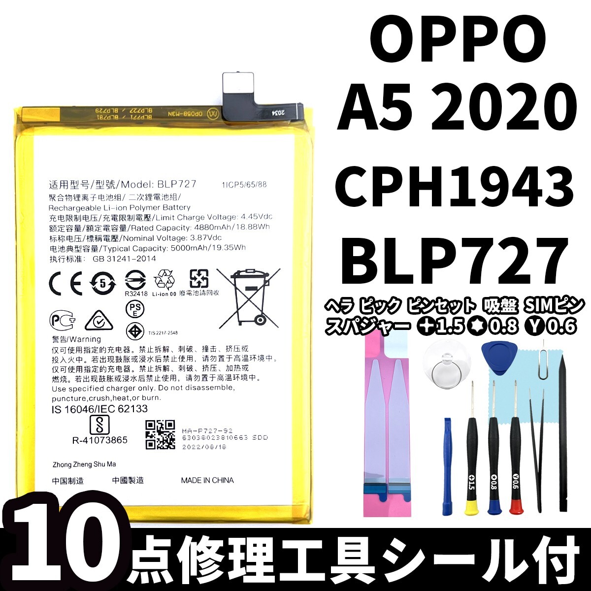 ★OPPO A5 2020バッテリー交換 CPH1943 BLP727 電池パック交換キット battery repair 電池交換専用両面テープ 修理工具付セット★