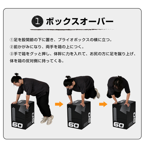• 【プライオボックストレーニングについて】1. ボックスオーバー ①足を股関節の下に置き、プライオボックスの横に立つ。 ②前かがみになり、両手を箱の上につく。 ③手で箱をグッと押し、体幹に力を入れて、お尻の方に足を蹴り上げ、体を箱の反対側に持ってくる。 2. サイドトウサイドプッシュオフ ①ボックスに乗せた足で斜め上に全力でジャンプします。 ②着陸の時、ボックスに乗せる足をすばやく左右入れ替えます。 3. ボックスジャンプ ヒザを曲げ、お尻を後ろに引いて、股関節から上体を前に倒しながら、腕を後ろの大きく振って勢いよくジャンプ。