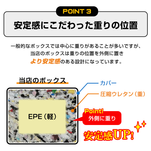 • 【 安定感にこだわった重りの位置】一般的なボックスでは中心に重りがあることが多いですが、 当店のボックスは重りの位置を外側に置き より安定感のある設計になっています。
