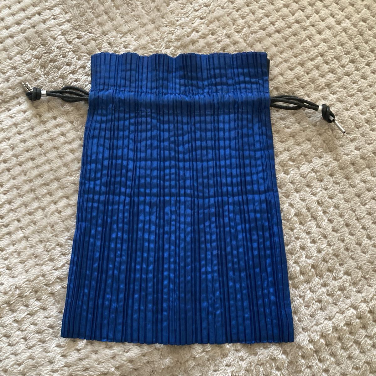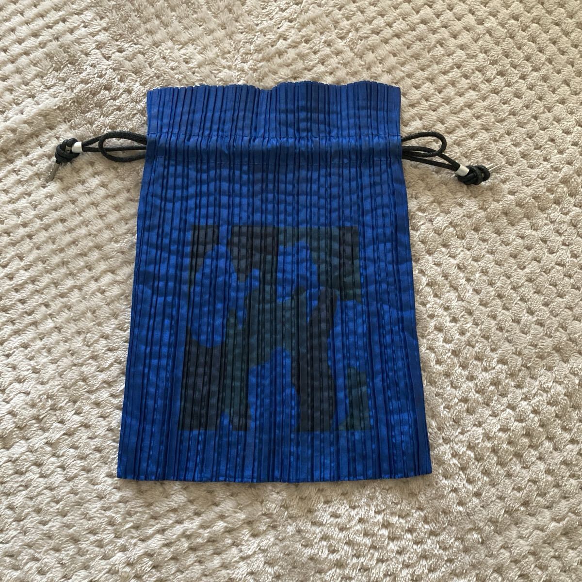 青い迷彩柄のプリーツポーチ、調整可能なドローストリング付き。