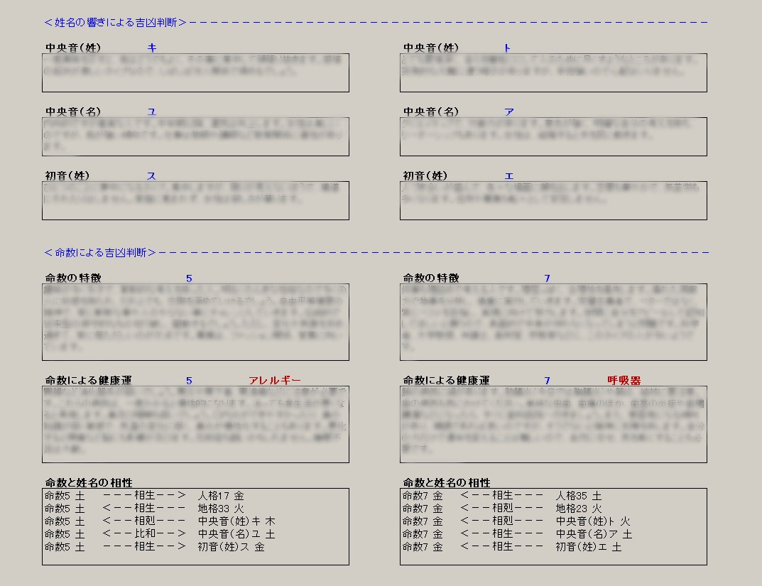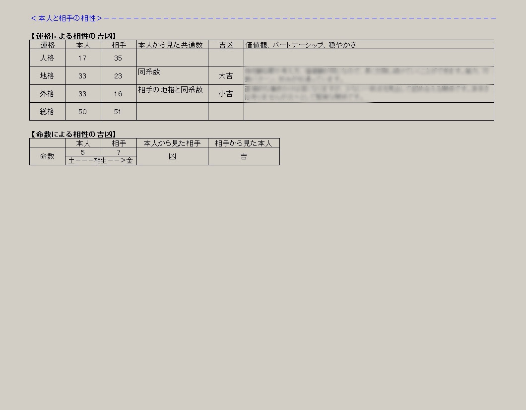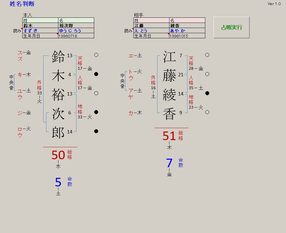 姓名の響きによる吉凶判断、命数による吉凶判断、本人と相手の相性