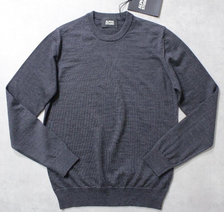 ALPHA STUDIO★新品3.5万円 アルファ ストゥディオ 定番EXファインメリノウールのクルーネックニット 50 ダークグレー