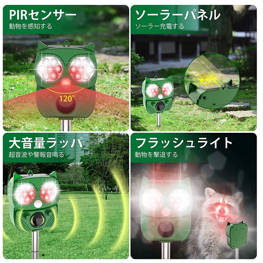 強いストロボ光や警報音を発することにより動物を撃退します。