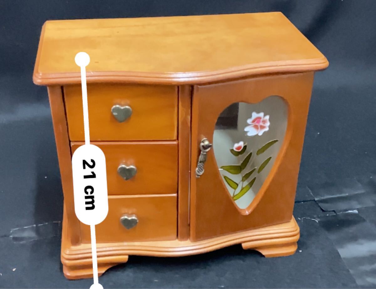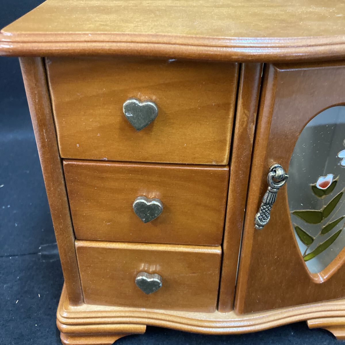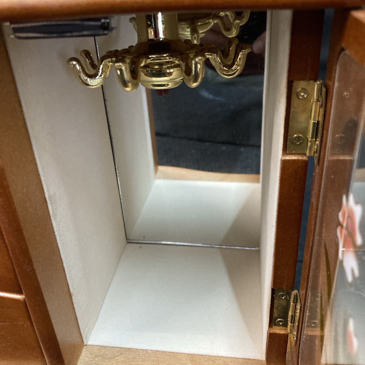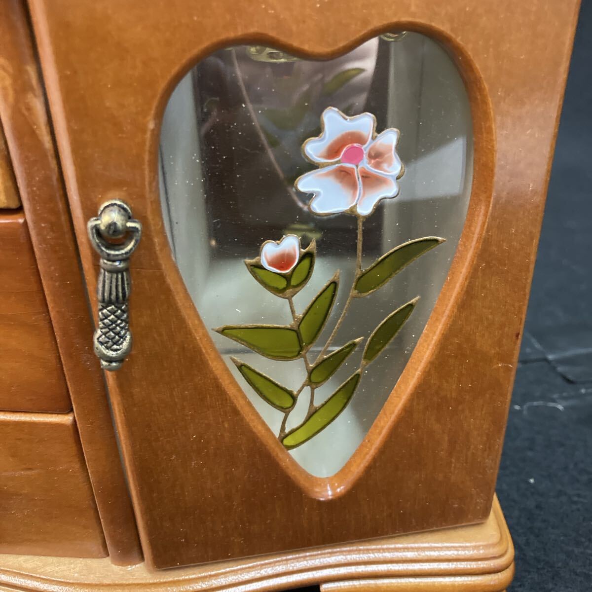花のモチーフの木製ジュエリーディスプレイキャビネット、引き出しと吊り下げ収納の組み合わせの、小型のアクセサリーBOXです。