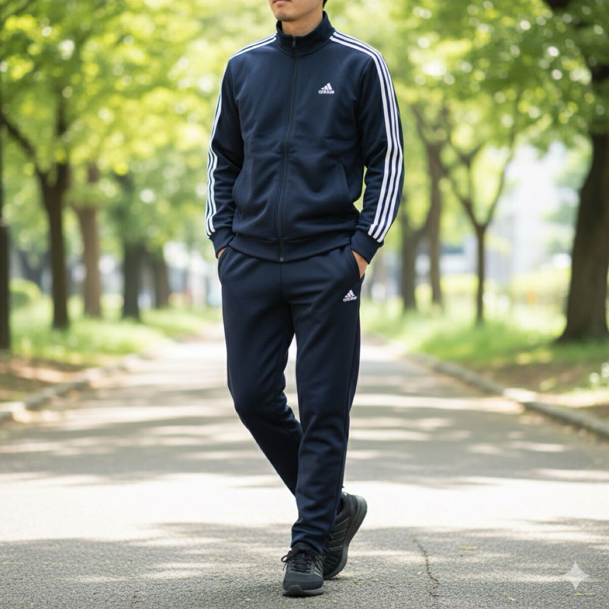 ネイビーの落ち着いたカラーにクラシックなスリーラインデザインが映える、スタイリッシュなアイテムです。
