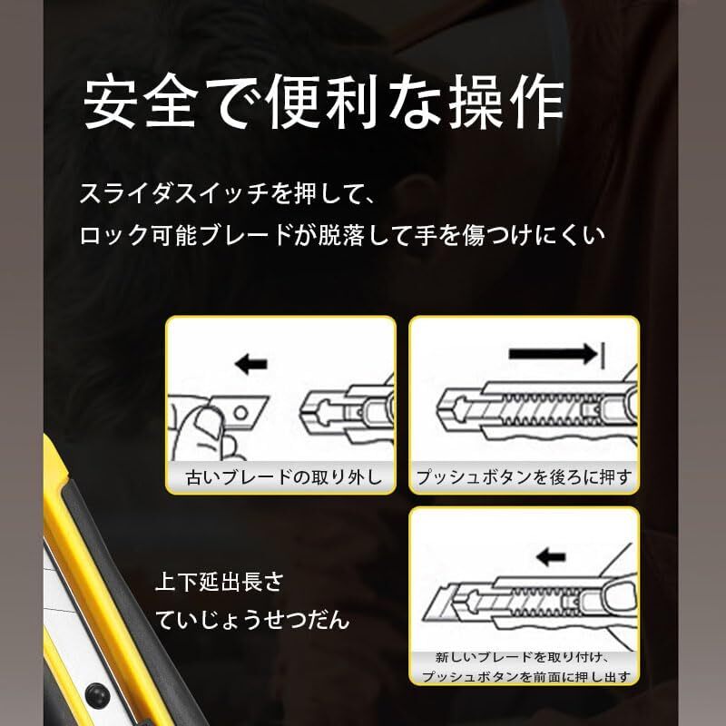 【安全性】スライダスイッチを押すことで、刃が外れにくく手を傷つけないようにロックすることができます。
