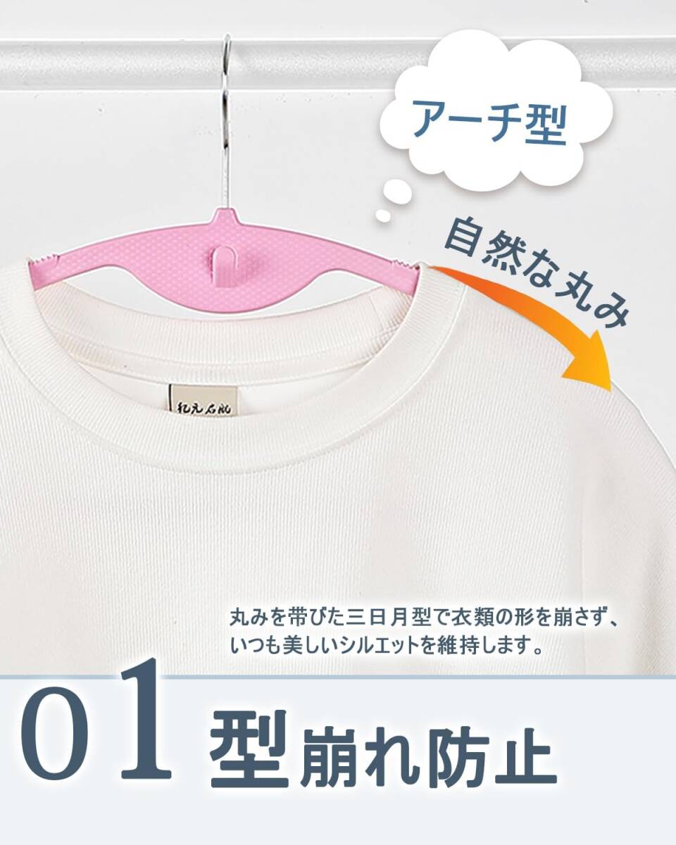 【滑らないハンガー】ラバー加工で衣類をしっかりキャッチします。サテンやシルクなど滑りやすい素材の衣類もしっかりと掛かりやすい仕様です。特殊なPET加工により、軽量でありながら丈夫で、変形しにくく、長期間使用可能です。優れた耐荷重性を持ち、コートやジャケットなどの重い衣類にも対応できます。