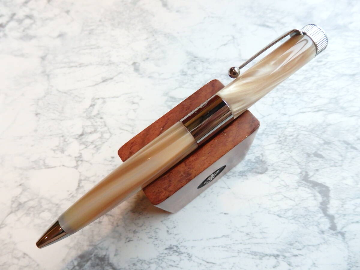 ブラウンレジン製の軸に天冠をツイストして芯の出し入れをするツイスト式ボールペンです。