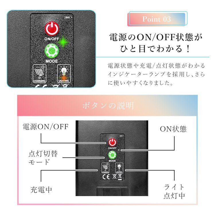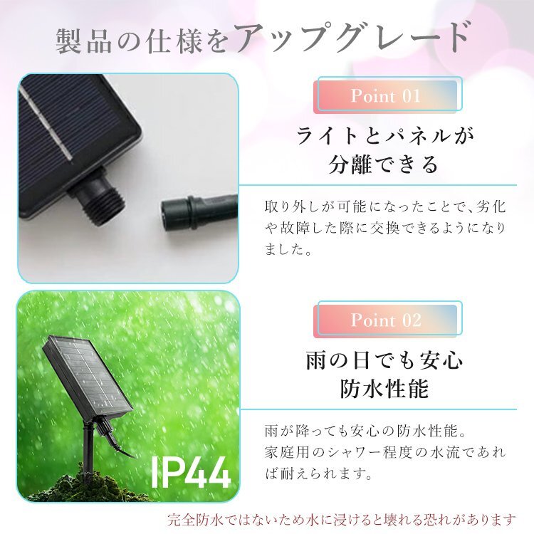 明るさセンサー付きで暗くなると自動点灯! 今の時代に最適なエコ商品!! 省エネ・長寿命なLEDライトは発熱がほとんどなく、植物に巻いても安心・安全! 屋外でも安心して使用できるようにIP44の防水加工。 多彩な8パターンの点灯モード搭載! コンセント不要なので、電源のない所でも自由にイルミネーションを楽しめます。 LEDを飾り付け、ソーラーパネルを太陽光が良く当たるところへ設置していただくだけで、簡単にご使用いただけます。 お庭の植え込みに、テラスやベランダに! クリスマスイルミネーションにピッタリです! 【商品詳細】 カラー:ホワイト×ブルー LED:300球 点灯パターン:8パターン 防水仕様:IP44 サイズ(約) ソーラーパネル:縦14cm×横9.5cm×厚さ2.5cm 支柱:20cm 電球の間隔:5cm コードの長さ(全体):32m (うちイルミネーション:30m) (ソーラーイルミネーションライト LEDライト ガーデンライト ライトアップ 防犯 クリスマス飾り クリスマスツリー 明るい 自動充電 電源不要 配線不要 夜間自動点灯 庭 ベランダ バルコニー 玄関 店舗 お店 オフィス パーティ 人気 おすすめ WEIMALL) |