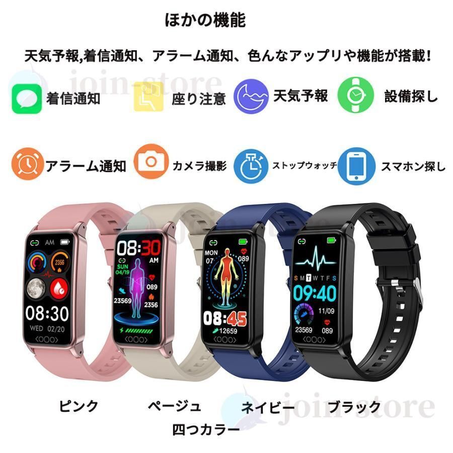 主な機能 - 心拍数モニタリング(生体検出機能付き)、血圧モニタリング、酸素、体温リアルタイムモニタリング、睡眠モニタリング、圧力測定、血糖モニタリング、尿酸モニタリング、脂質モニタリング、ストップウォッチ、歩数計、カロリー、距離、運動モード、着信注意、目覚まし注意、長居注意、手を上げて画面を明るくし、社交共有(LINE,Twitter,Instagram、Facebook、Whatsapp)など、写真を撮る、生理周期、体温が高すぎる注意、心拍数が高すぎる注意、水を飲む注意、薬を飲む注意、アップルの健康への接続、スマホン探し、スマートウォッチ探し、電話拒否、15国以上言語対応