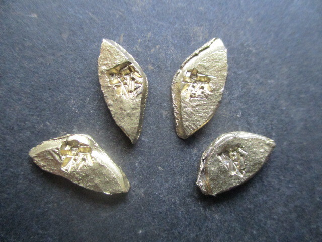 甲州金では一匁(3.75g)以下の量目は端金(はきん)と呼ばれます。武田氏滅亡(天正十年、1582年)後の四金座(松木家・志村家・野中家・山下家)の中で、松木家と志村家の端金が多く確認されています。