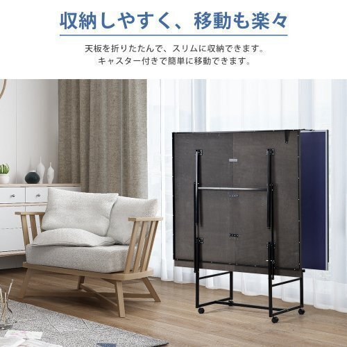 【収納しやすく、移動も楽々】天板を折りたたんで、スリムに収納できます。 キャスター付きで簡単に移動できます。