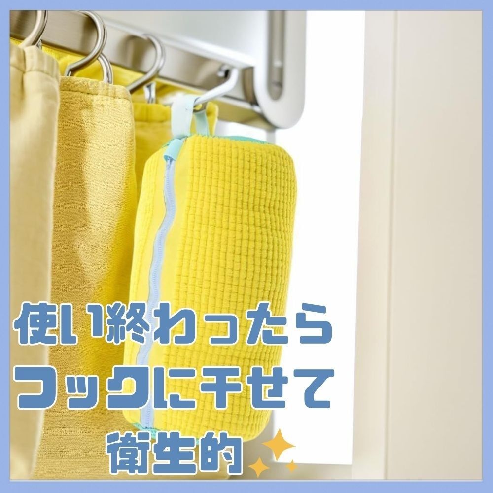使い終わったあとはそのままフックに吊るして乾燥できるので、とっても衛生的