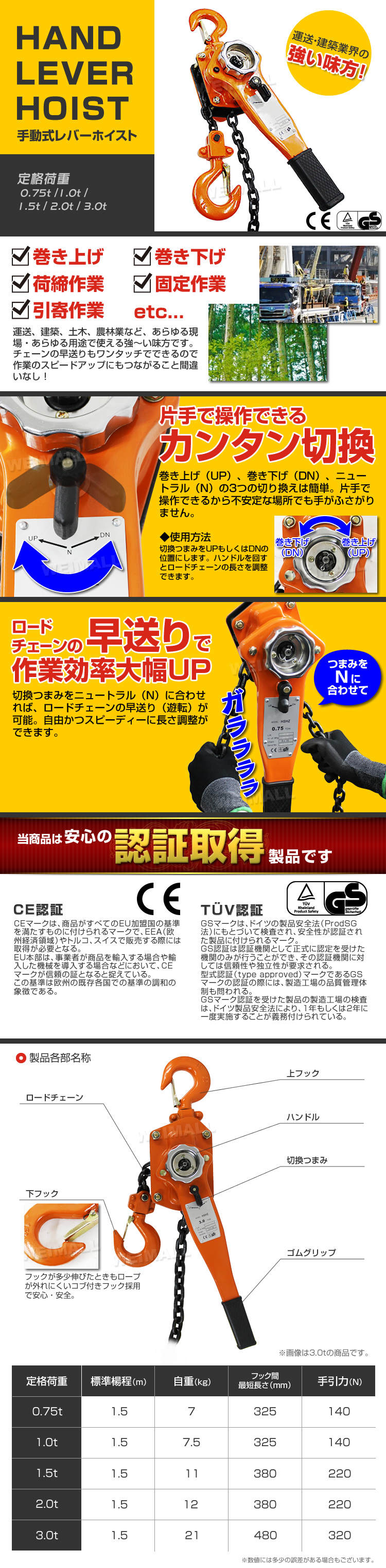 チェーンの早送りもワンタッチでできるので作業のスピードアップにもつながること間違いなし!! 【使用用途】 ・重量物の緊縛輸送 ・鉄骨の歪み取り ・大型機械や荷物などの引き寄せ ・建築物の芯だし ・板金塗装のフレーム修正 ・山林業や果樹園での原木搬出・抜根・杭抜作業 ・景石・柱石・ヒューム管などの据付作業 ・運輸・橋梁・建設・土木・造船・林業などの荷揚げ・揚重・現場作業 【仕様】 ・最大能力・・・・・・・1,000kg ・チェン線径・・・・・・φ5.8mm ・巻き取りチェン長さ・・・・1.5m ・フック開口寸法・・・・・・28mm ・上下フック間最小寸法・・・325mm ・ハンドル長さ・・・・・・280mm ・重量・・・・・・・・・7.5kg ※写真と実物は多少異なる場合がございます。あらかじめご了承下さい。 |