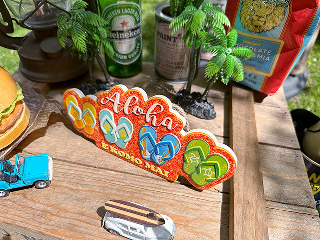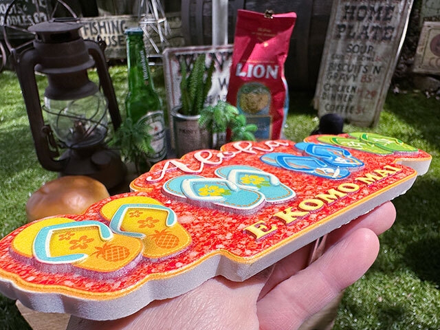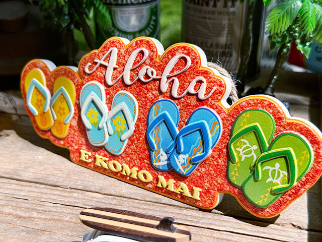 玄関周りに吊り下げてウェルカムプレートにしたり、ちょっとした空きスペースにハワイアンコーナーを作るときの立て看板にしたり・・・・
