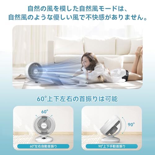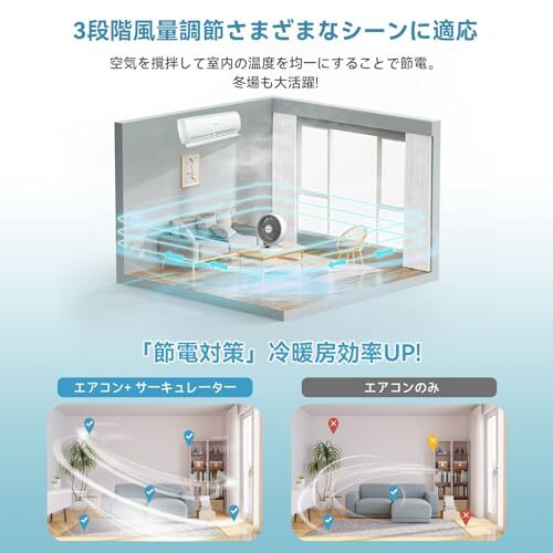 【強力な風量と広範囲送風】このサーキュレーターは、強力なモーターを搭載しており、パワフルな風量で部屋全体に風を送り出します。特殊設計のプロペラにより、最大で20畳(約33平方メートル)の広範囲に風を届け、約7m先まで届く強力な送風を実現します。効率的な空気循環を実現します。これにより、夏はエアコンと併用することで涼しく、冬は暖房と併用することで暖かい空気を効果的に循環させ、季節を問わず快適な室内環境を提供します。