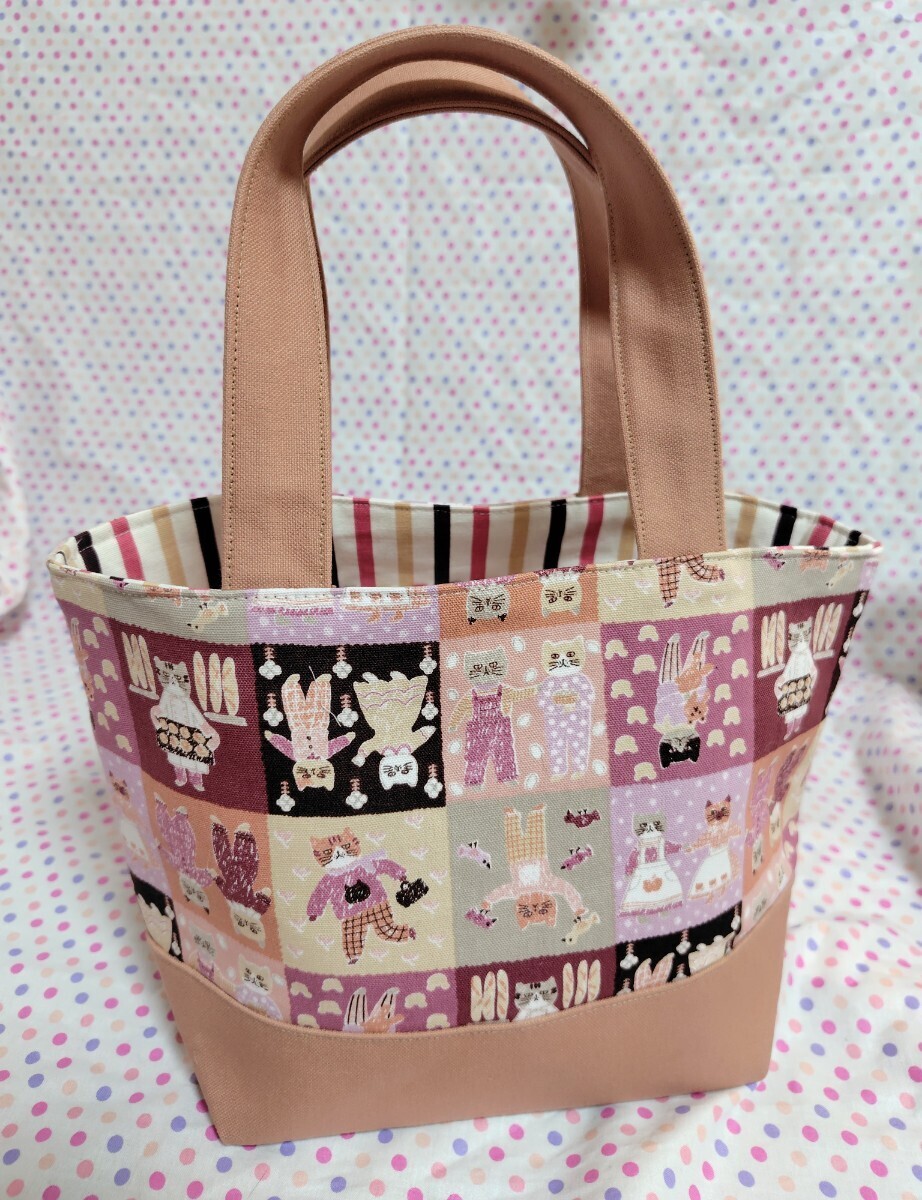 レトロな猫さんが可愛いパッチワーク風の生地を使ったミニトートバッグです。ちょっとしたお出かけやお弁当袋などを入れるバッグにピッタリ♪内ポケット1つ付きです♪
