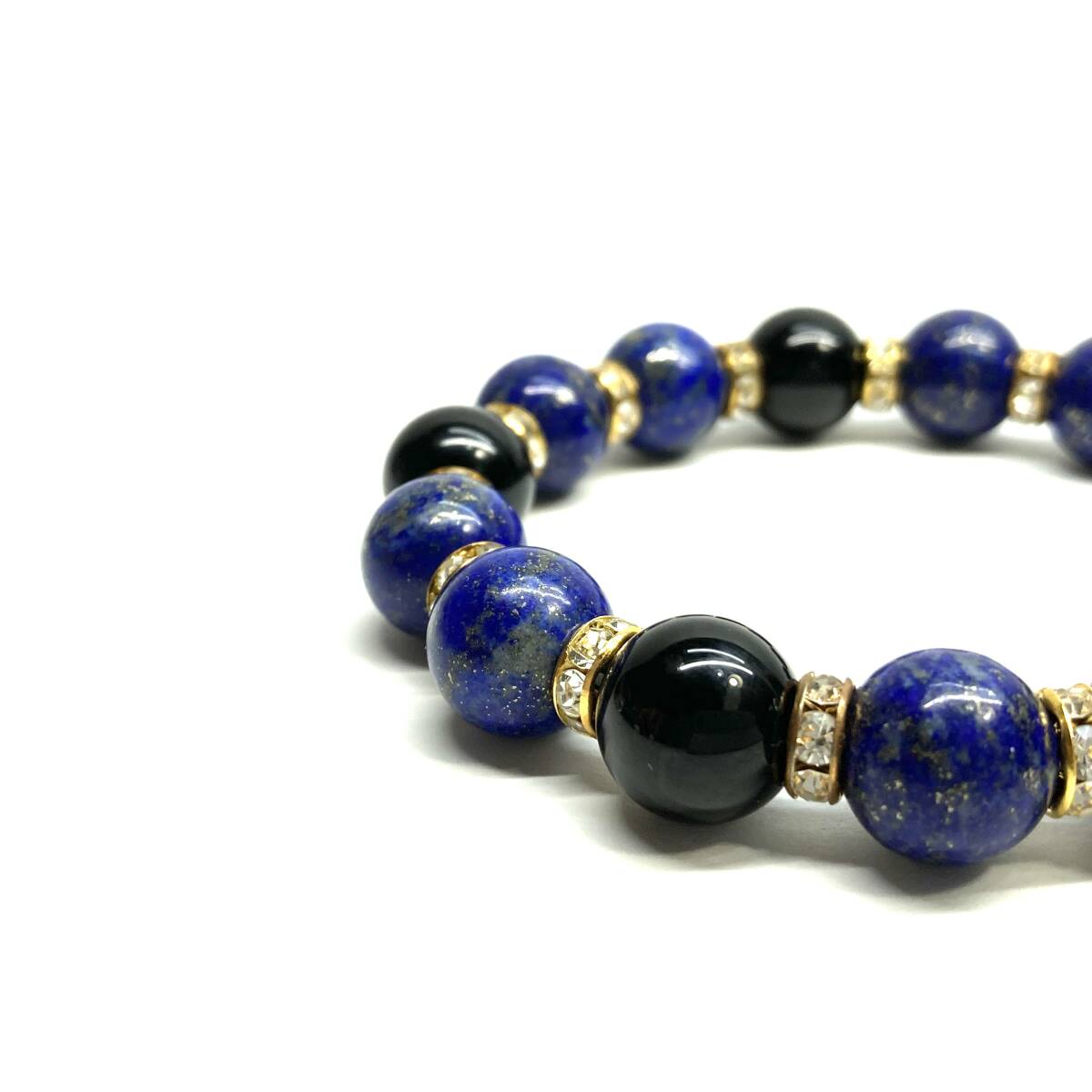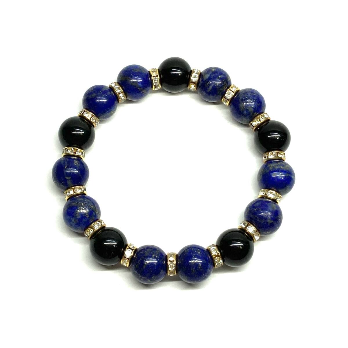 こちらは、ラピスラズリとモリオンを組み合わせたパワーストーンブレスレットです。間にはロンデルを挟み高級感あるデザインに仕上げております。程よくインパクトがある12mm玉を使用して内周約18cmです。(サイズ変更の場合は取引ナビにてご連絡をお願いします。) 数に限りがございますので気になる方はお早めにどうぞ。