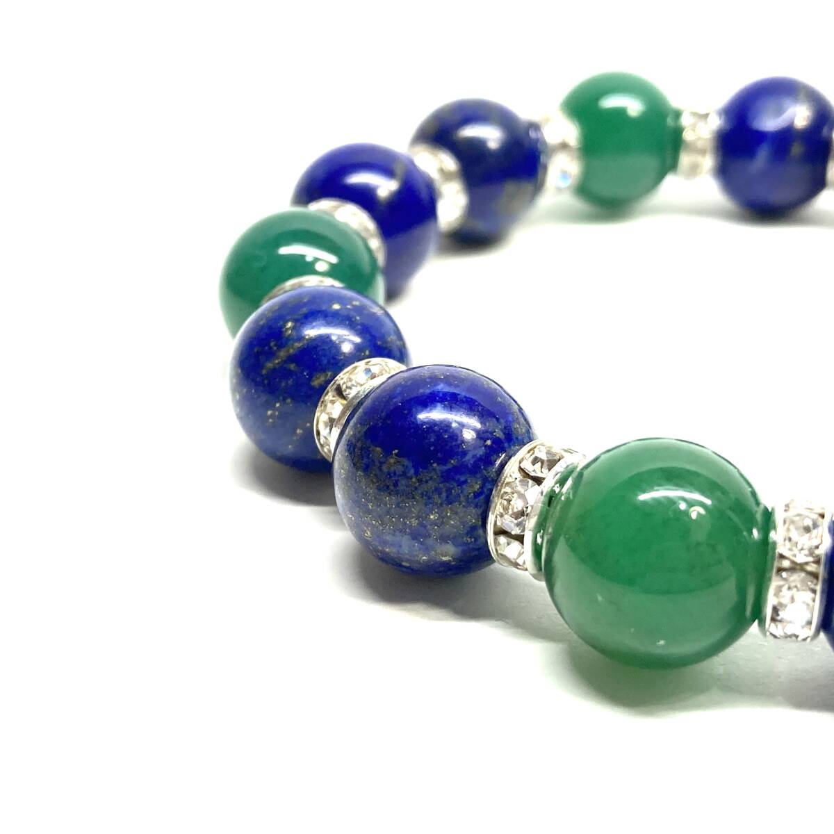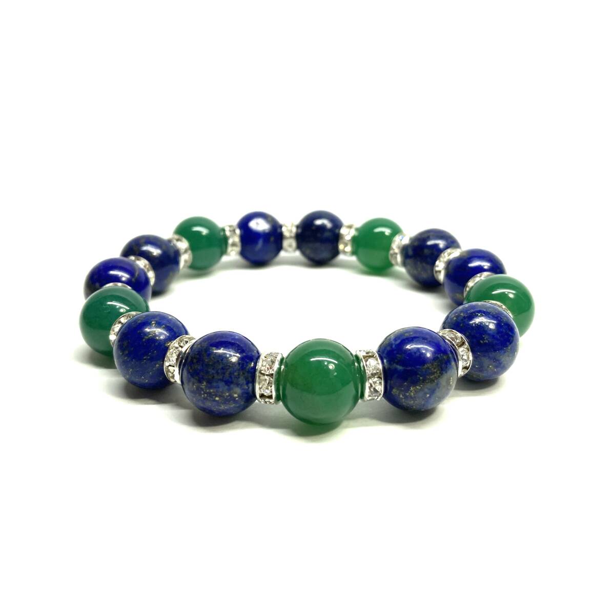 こちらは、ラピスラズリと緑瑪瑙を組み合わせたパワーストーンブレスレットです。間にはロンデルを挟み高級感あるデザインに仕上げております。程よくインパクトがある12mm玉を使用して内周約18cmです。(サイズ変更の場合は取引ナビにてご連絡をお願いします。) 数に限りがございますので気になる方はお早めにどうぞ。