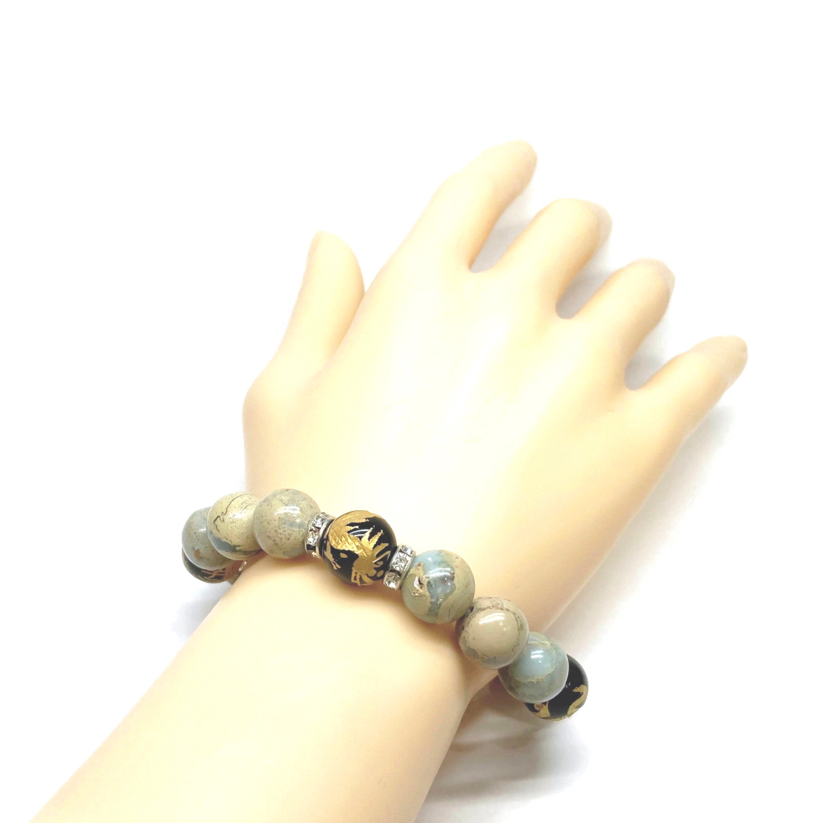こちらは、四神獣金彫オニキとインプレッションストーン組み合わせたパワーストーンブレスレットです。四神獣は、中国の伝説で4つの方向(東西南北)を守護する神聖な神。四神獣、厄災から身を守り、多くの運気を呼び込むと言われております。石大きさは程よくインパクトのある12mm玉で内周 約17cmです。 数に限りがございますので気になる方はお早めにどうぞ。
