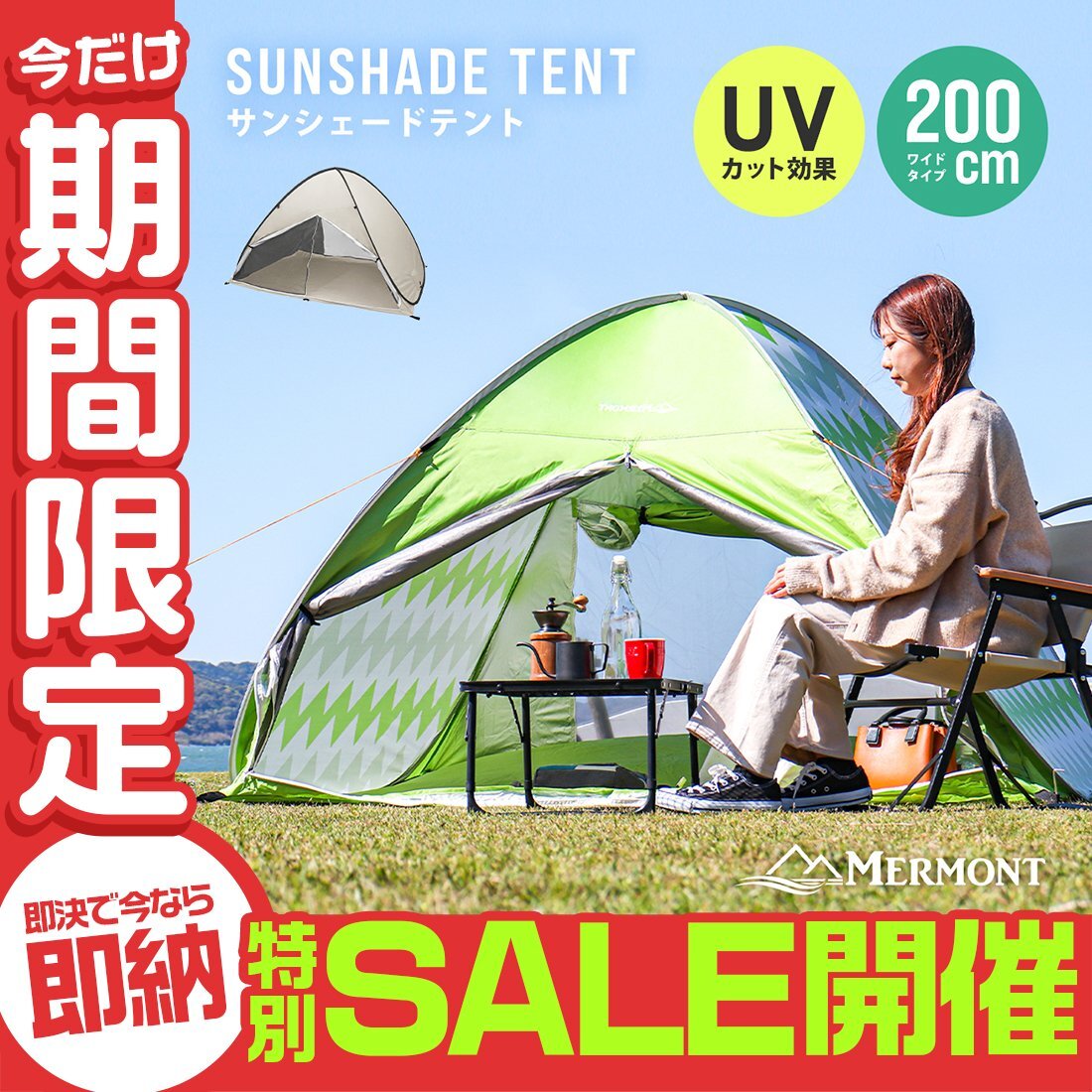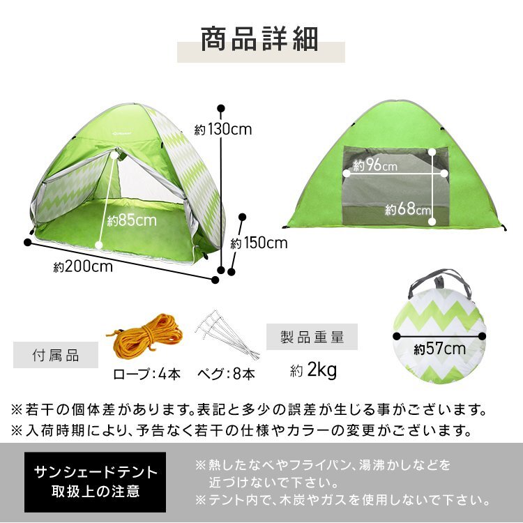| 取り出してすぐ設置!パッと開くだけで使える! 日よけ・荷物置きにも最適なフルクローズサンシェードテントです。 海水浴やピクニック、アウトドアに最適! 大人が余裕で寝ころぶことが出来るサイズで、暑い日ざしの日よけや荷物置きとしてもGood! 強い日差しの下でも紫外線から守る遮断コート生地採用! 組み立て不要!ワンタッチで使えて持ち運びもとても便利です。 メッシュスクリーンが前後にあるので、蚊や虫の侵入を防ぎながら換気が出来ます。 簡易ロック付で防犯面でも安心! 【商品仕様】 使用時(約):幅200×奥行150×高さ130cm 収納時(約):幅57×奥行57×厚さ4.5cm 重さ(約):2kg カラー:アイスグレー 【商品内容】 テント本体、ペグ8本、ロープ4本、キャリーバッグ 【注意事項】 ・熱したもの(鍋/やかん等)を近づけないでください ・テント内で火気、木炭やガスを使用しないでください ・シェブロンカラーには収納ポケットが付いておりません (ビーチテント ワンタッチ メッシュ デイキャンプ バーベキュー 運動会 海 公園 震災 災害 避難所 2人 3人 4人) |