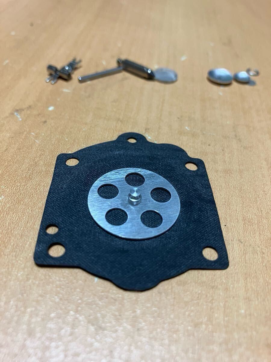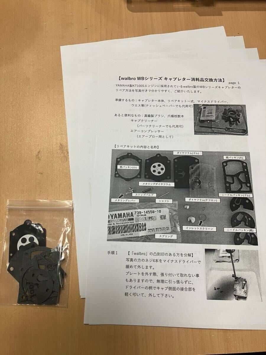 KT100Sのキャブレター「walbro WB3A」の消耗品の交換の仕方が写真付きで詳しく、分かりやすく解説されている説明書(6ページ)と汎用品のWB3A用のリペアキット1つ(スプリング無し)のセットです。スプリングは現在お使いのものを再利用して下さい。
