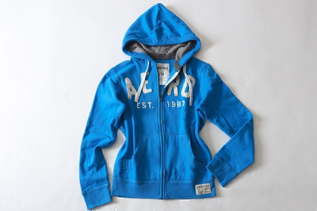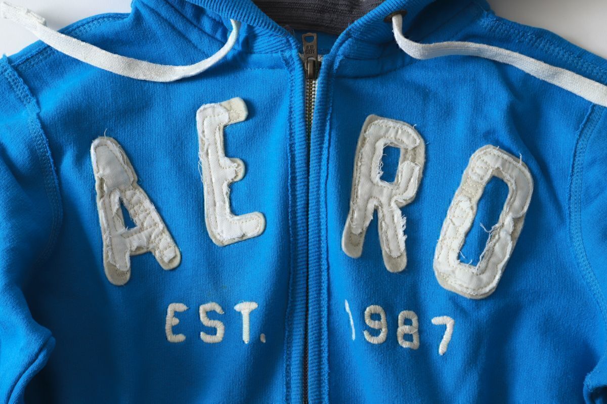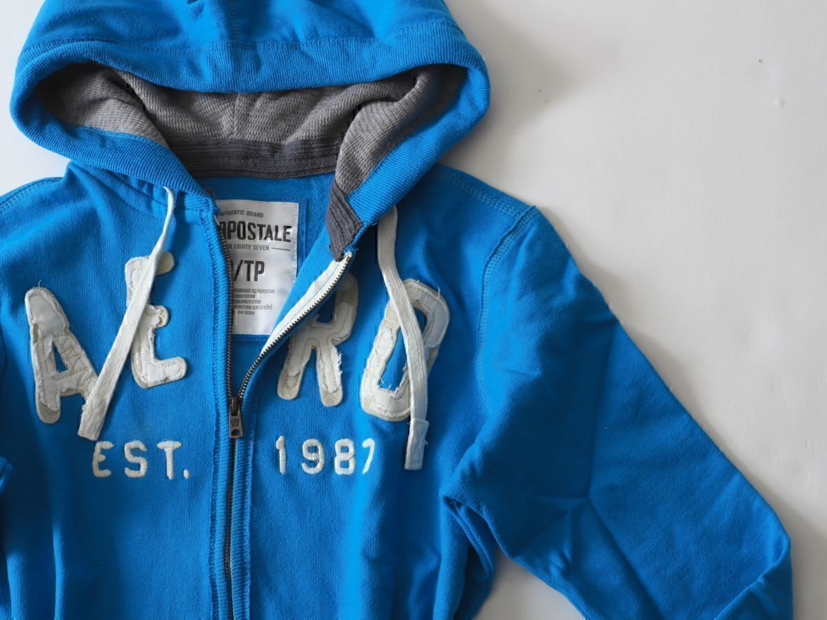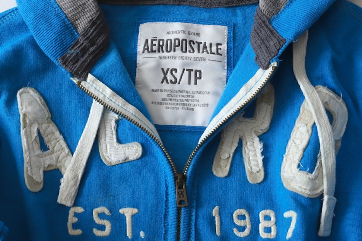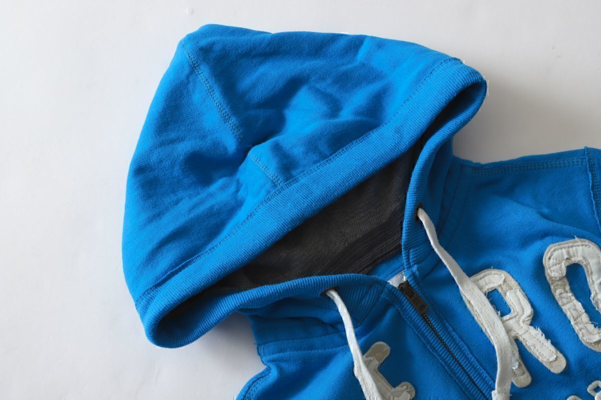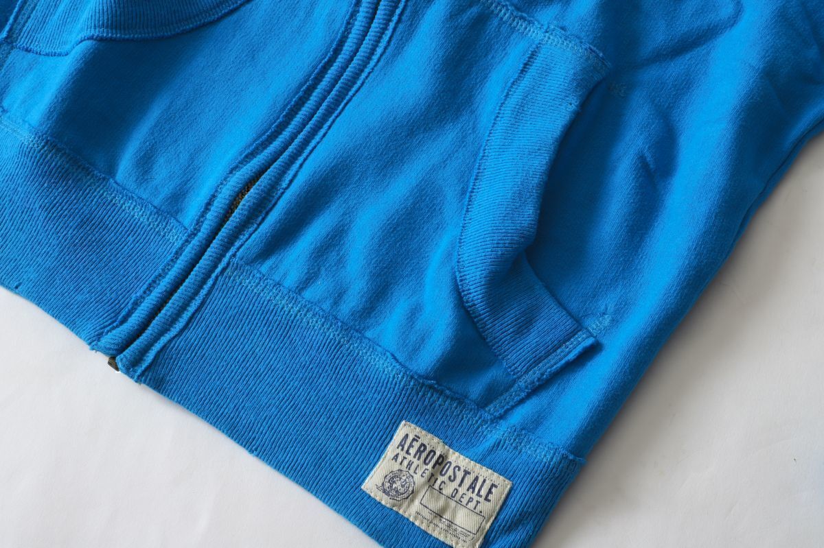 美品★AEROPOSTALE エアロポステール★ 定番ロゴスクラッチジップアップパーカー★XS★ブルー青【本物保証】ダメージ加工★裏起毛 アバクロ