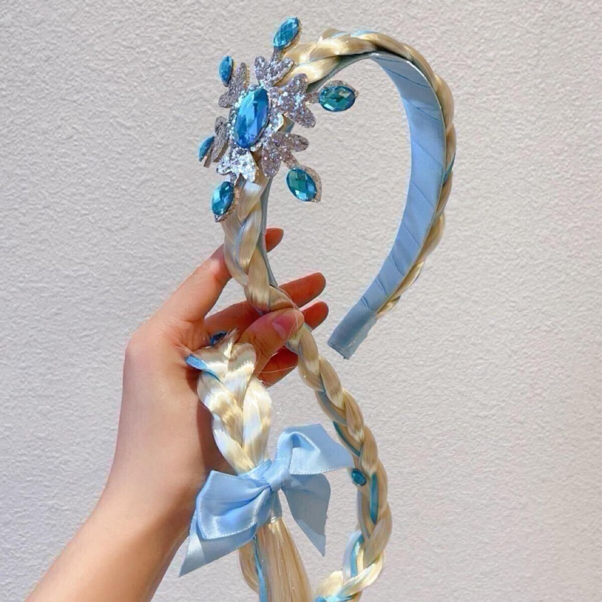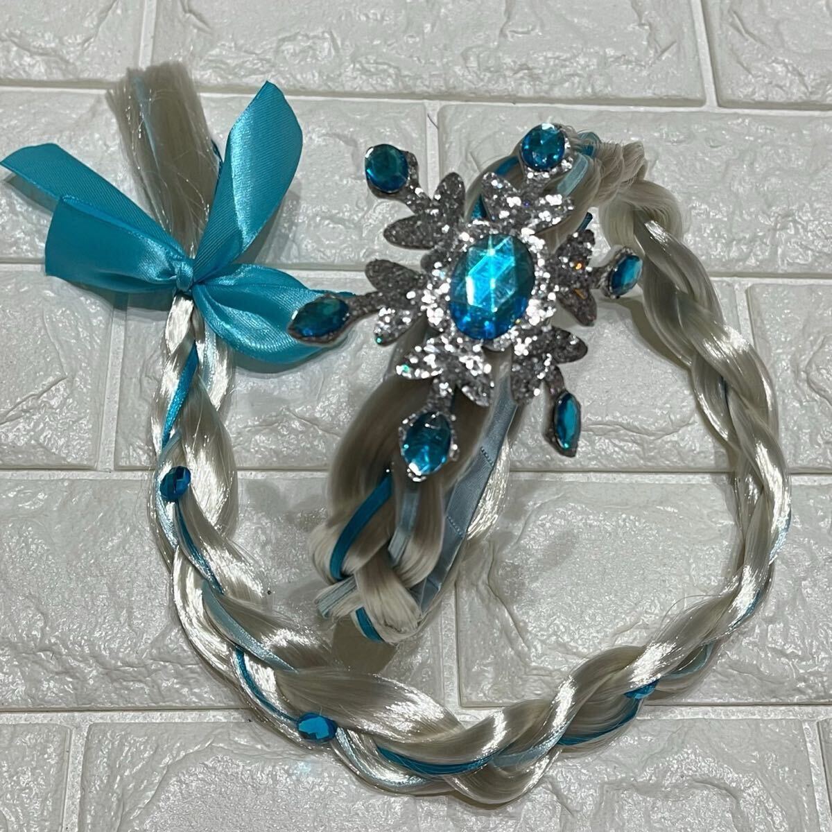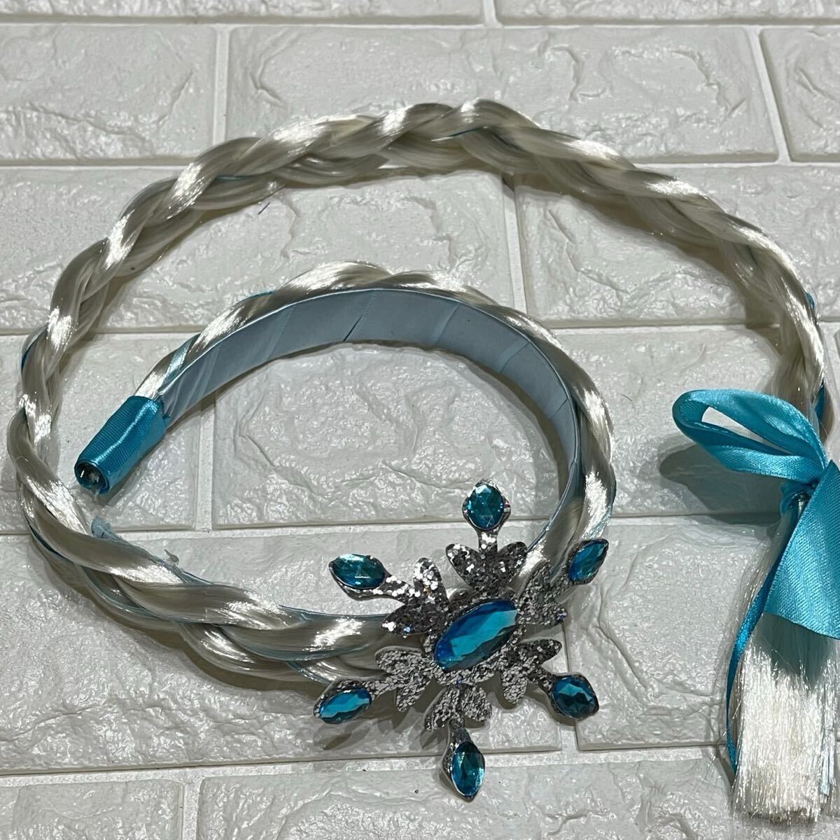 シルバーの三つ編みにブルーの飾りが付いたプリンセスヘアのカチューシャです