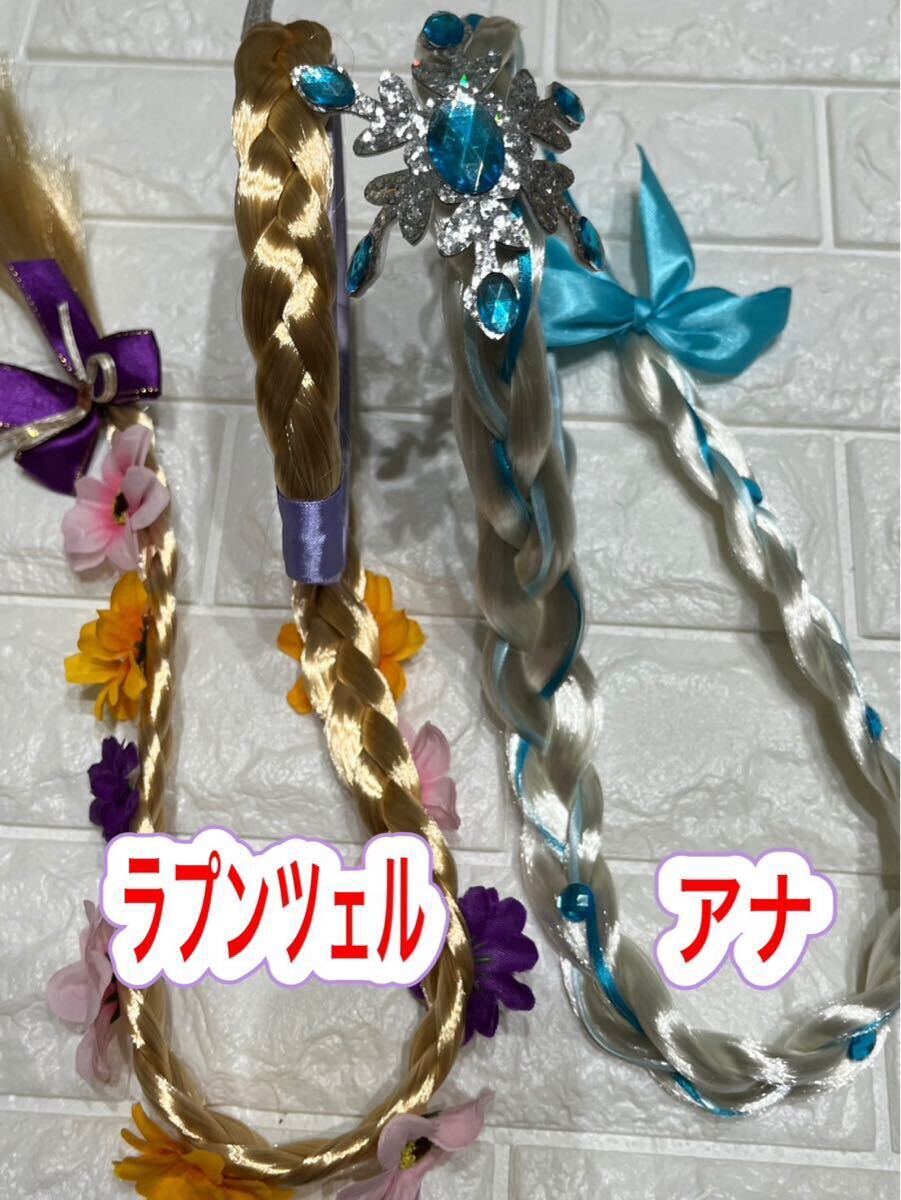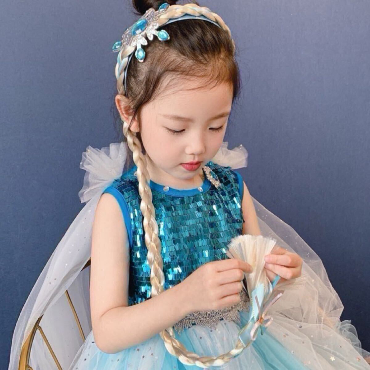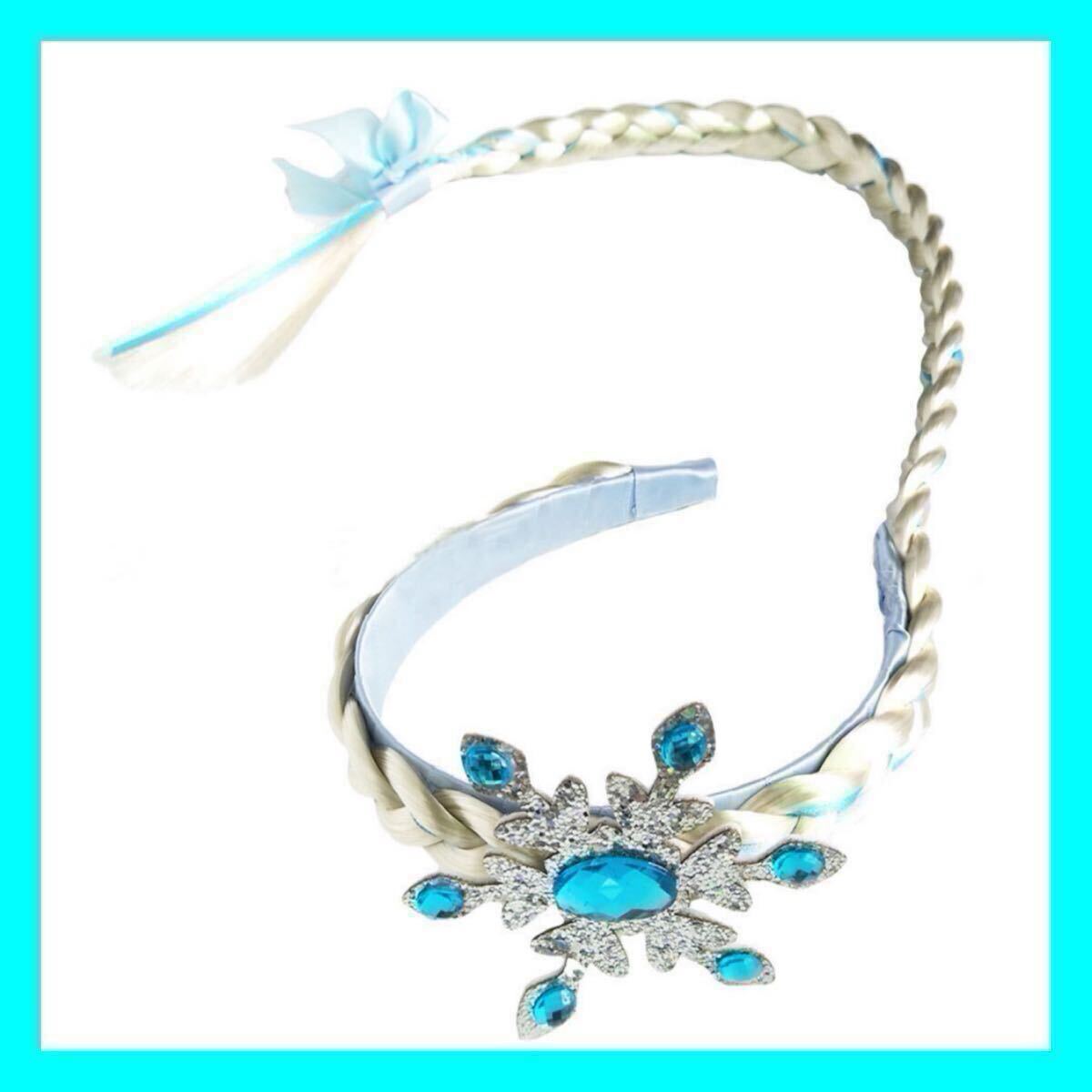 シルバーの三つ編みにブルーの飾りが付いたプリンセスヘアのカチューシャです