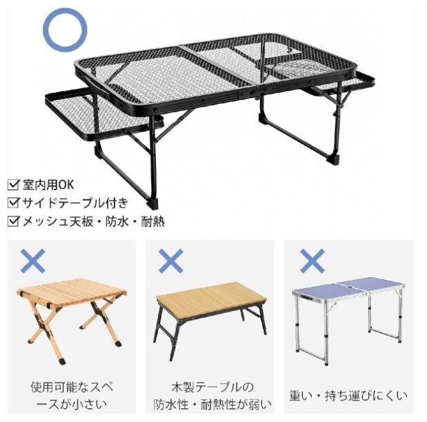 ャンプ テーブル メッシュ アウトドアテーブル 折り畳み サイドテーブル付き 軽量 コンパクト ローテーブル 折りたたみ 耐熱 耐重荷50kg