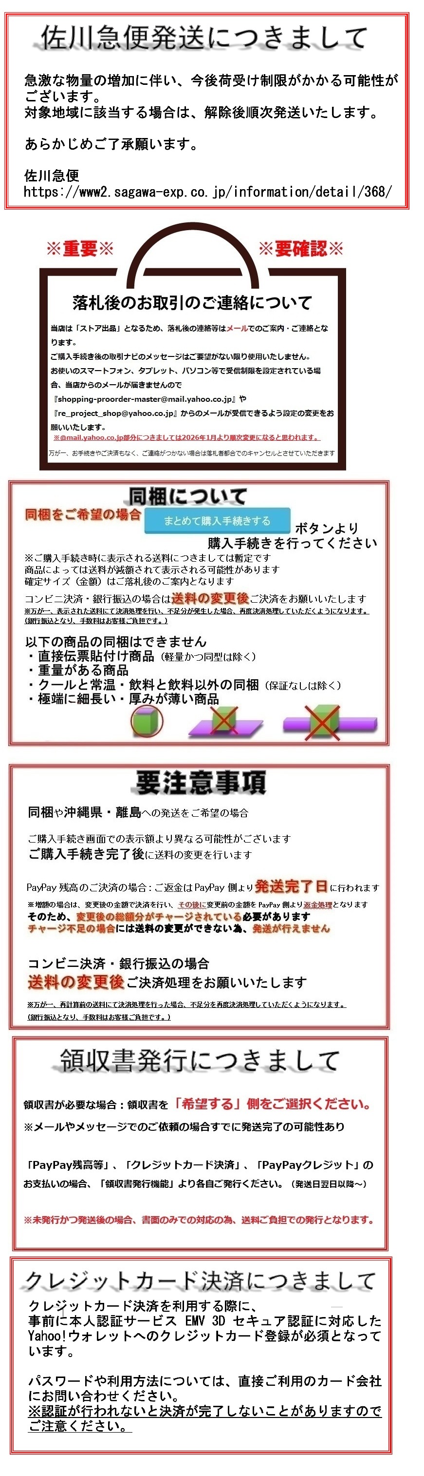 ※同梱可能商品に限ります。 定形郵便や定形外郵便(規格内)と定形外郵便(規格外)の同梱(定形外郵便発送)につきましては 佐川急便をご選択の上、ご要望欄に定形外郵便発送希望とご入力ください。 ご購入手続きが完了ののち、当方より手動で『お支払い総額のご案内』と『送料の変更』をいたします。 ご決済時の注意事項は下記をご高覧願います。 ◆沖縄県・離島への発送、同梱希望の場合のご決済について ■クレジットカード決済、PayPayクレジット 再度オーソリゼーションが行われます。 万が一、通らなかった場合は銀行振込となります。 ■銀行振込の場合 ご案内前の内容ではご決済しないようにお願いいたします。 万が一、不足金額にてご入金いただいた場合、不足分の追加入金の確認ができるまで商品の発送ができませんのでご了承ください。 超過分につきましては、銀行振込にて手数料を差し引いてのご返金となります。 ■コンビニ決済の場合 (※12月はご利用できません) 再度お支払番号を発行いたしますので、新たなお支払番号にてご決済ください。 ■PayPay残高等払いの場合 ご購入手続き時の表示金額より減額・増額により、お手続きが異なります。 減額となる場合: 発送完了日にPayPay側より返金処理となります。 増額となる場合: 変更後の金額で決済を行い、 その後に変更前の金額をPayPay側よりご返金処理となります。 ※増額となる際にチャージ不足の場合には、送料の変更ができない為、発送が行えません。 不足額のみのご決済はYahoo!オークションシステム上、銀行振込のみ対応可能です。 Yahoo!ショッピングヘルプ PayPay残高等払いについて(旧名称:PayPay残高払い・PayPay(残高)) https://support.yahoo-net.jp/PccShopping/s/article/H000011025#changeamount ◆普通郵便でのオプションについて