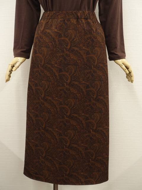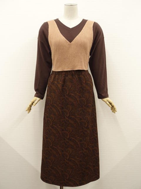 洗えるニットビスチェ+長袖カットソー+ロング丈ストレートスカート コーディネート上下3点セット M相当 ブラウン系/ブラウン/ブラウン地 ネイビー ブラウン ペイズリー柄 カジュアル・シンプル系 20代、30代