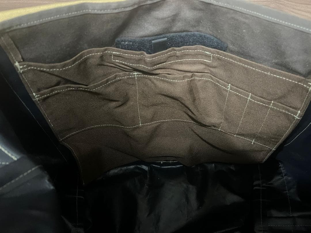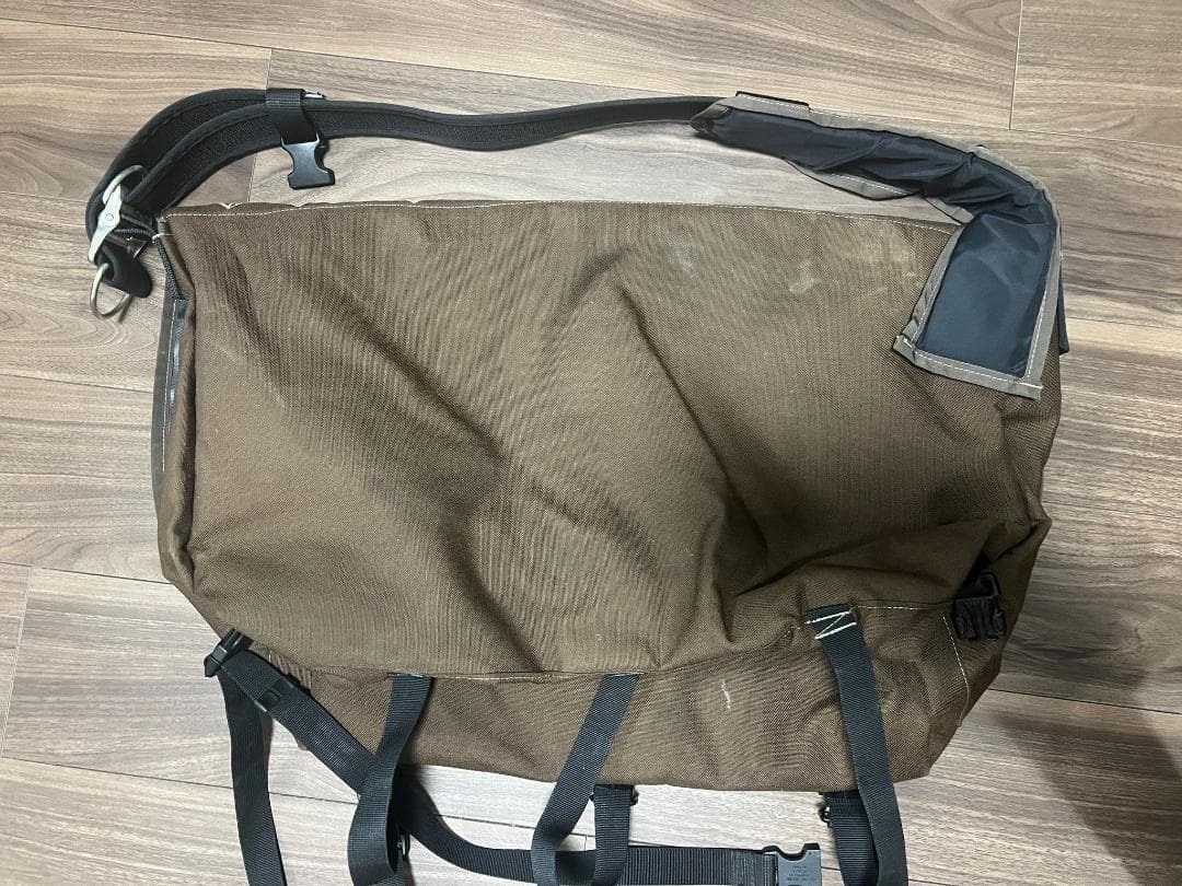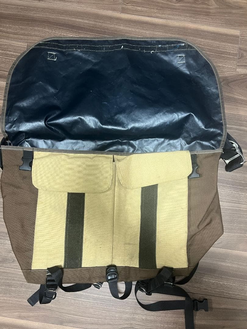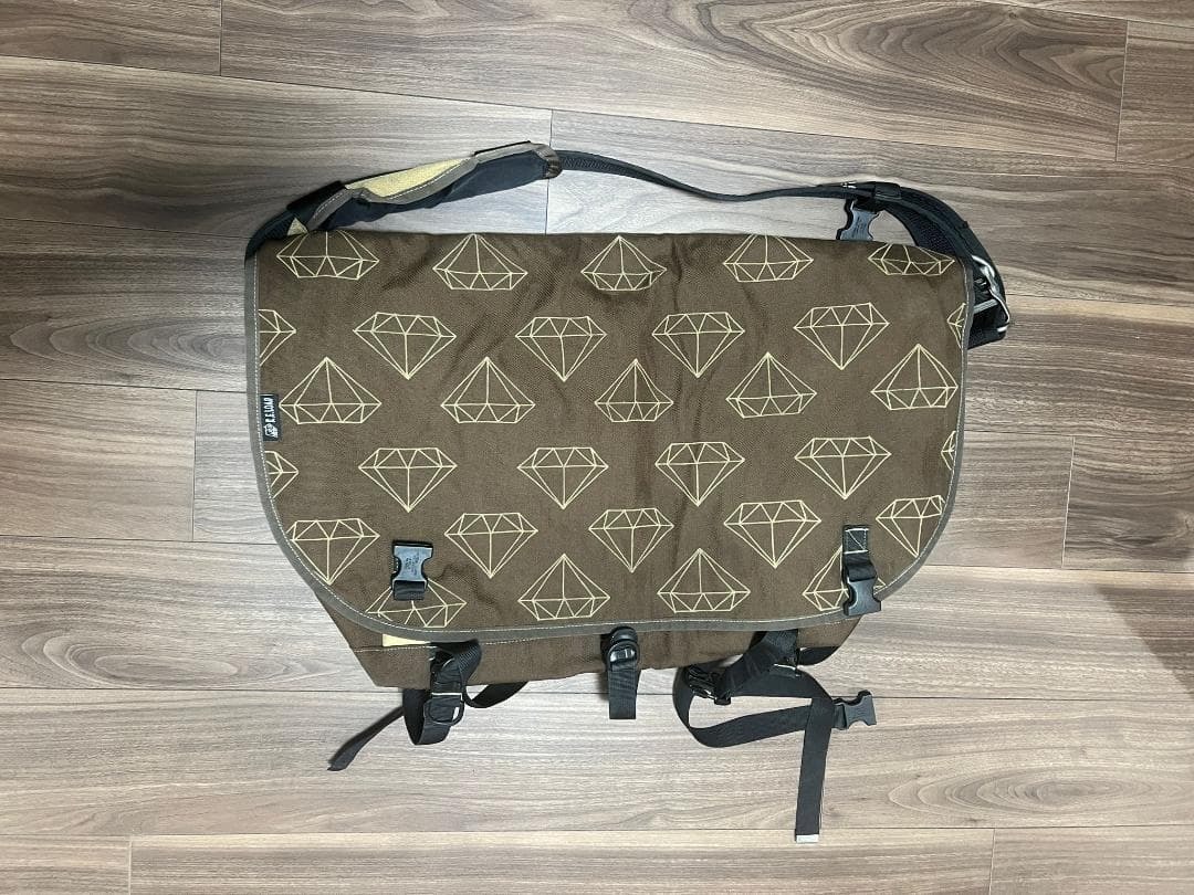 アメリカのR.E.Load社製のダイヤモンド柄ステッチのメッセンジャーバッグです。使用による汚れが多少あります。 このバッグは大きくてたくさんのものが入ります。 寸法: 幅67cm、高さ42cm ブランド: R.E.Load 色: 茶色 タイプ: メッセンジャーバッグ 特徴: フラップ付き、バックル留め 素材: ナイロンとキャンバス