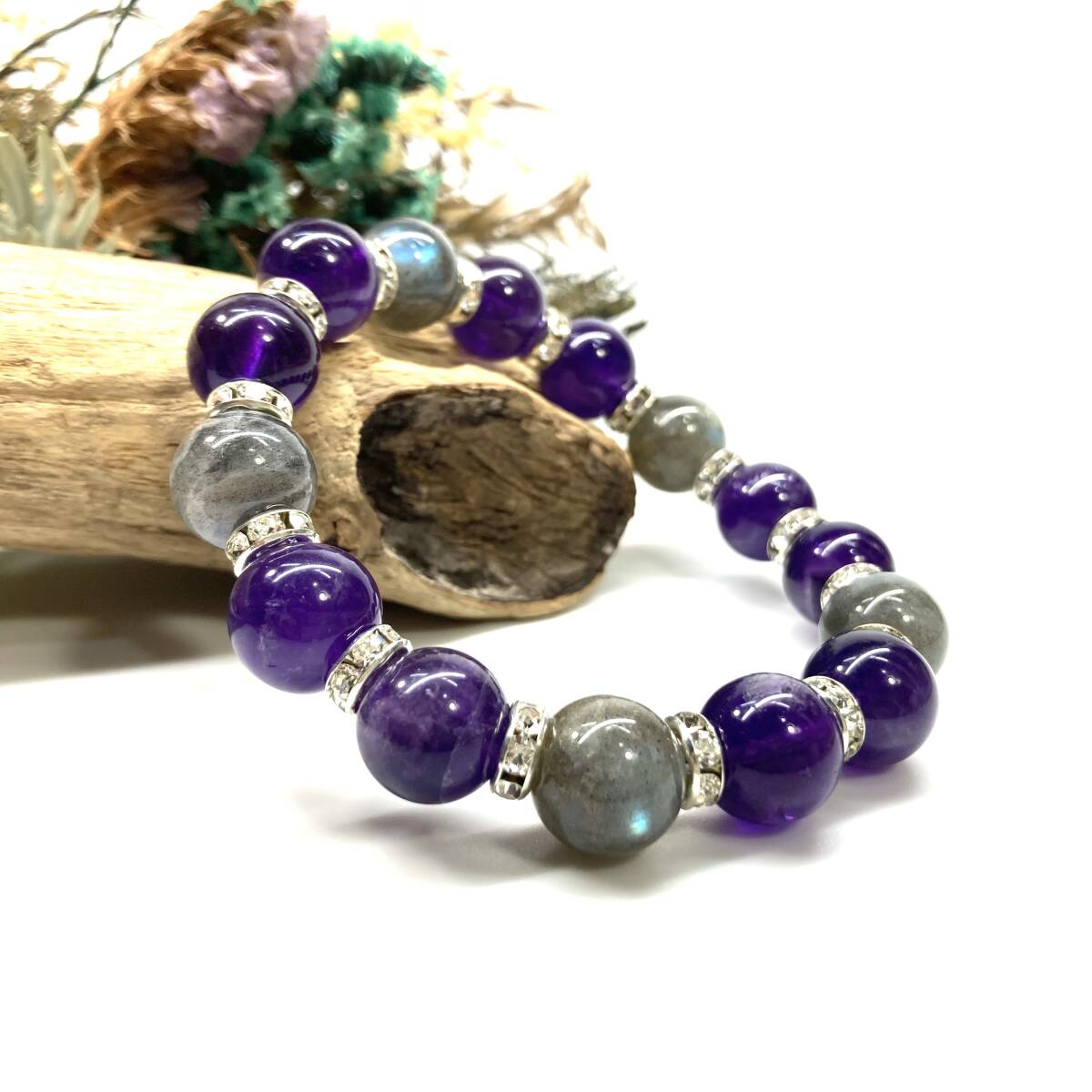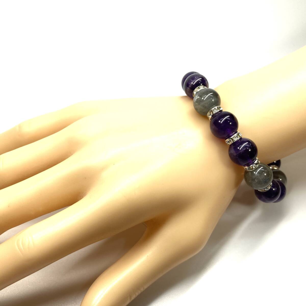 こちらは、ラブラドライトとアメジストを組み合わせたパワーストーンブレスレットです。間にはロンデルを挟み高級感あるデザインに仕上げております。石大きさは12mm玉を使用して内周約18cmです。気になる方は是非この機会にどうぞ。
