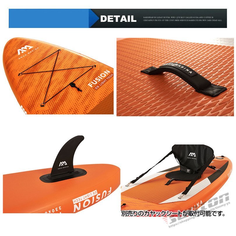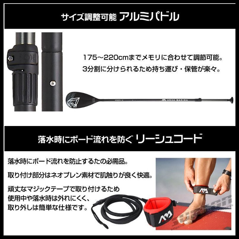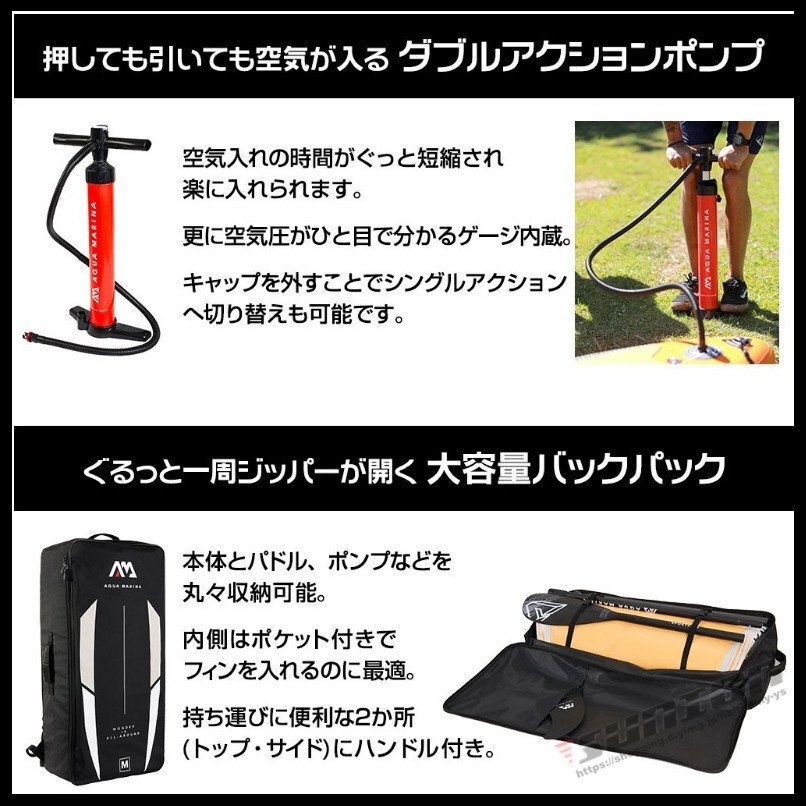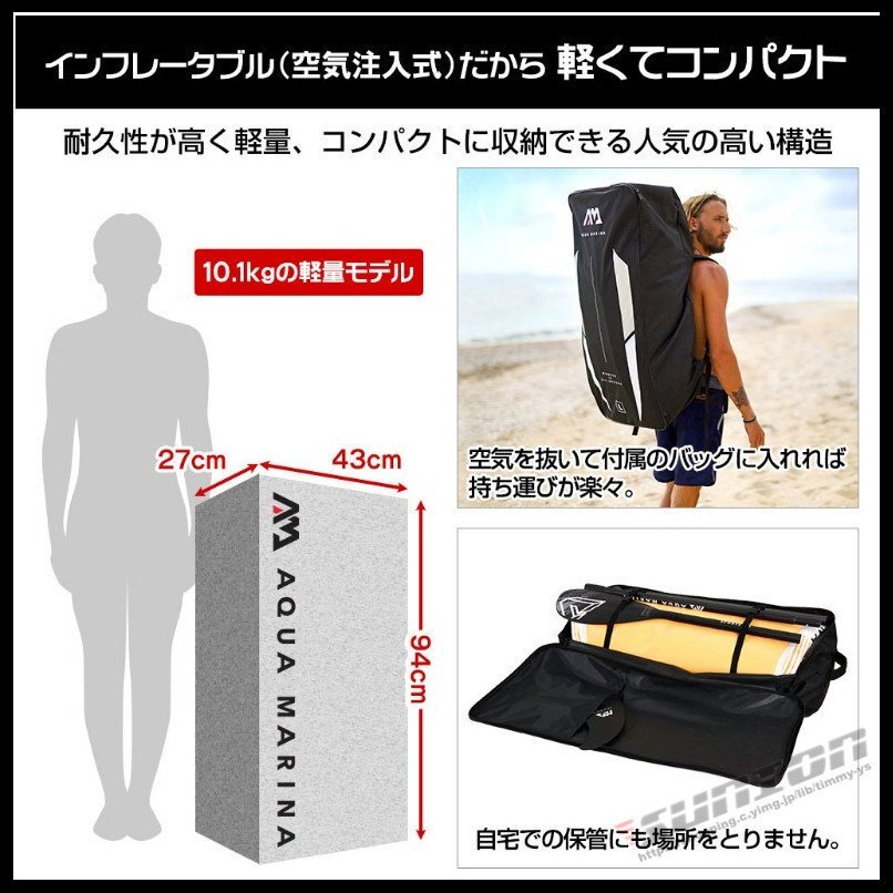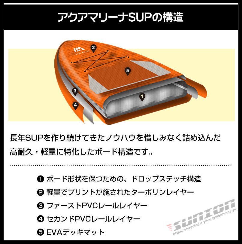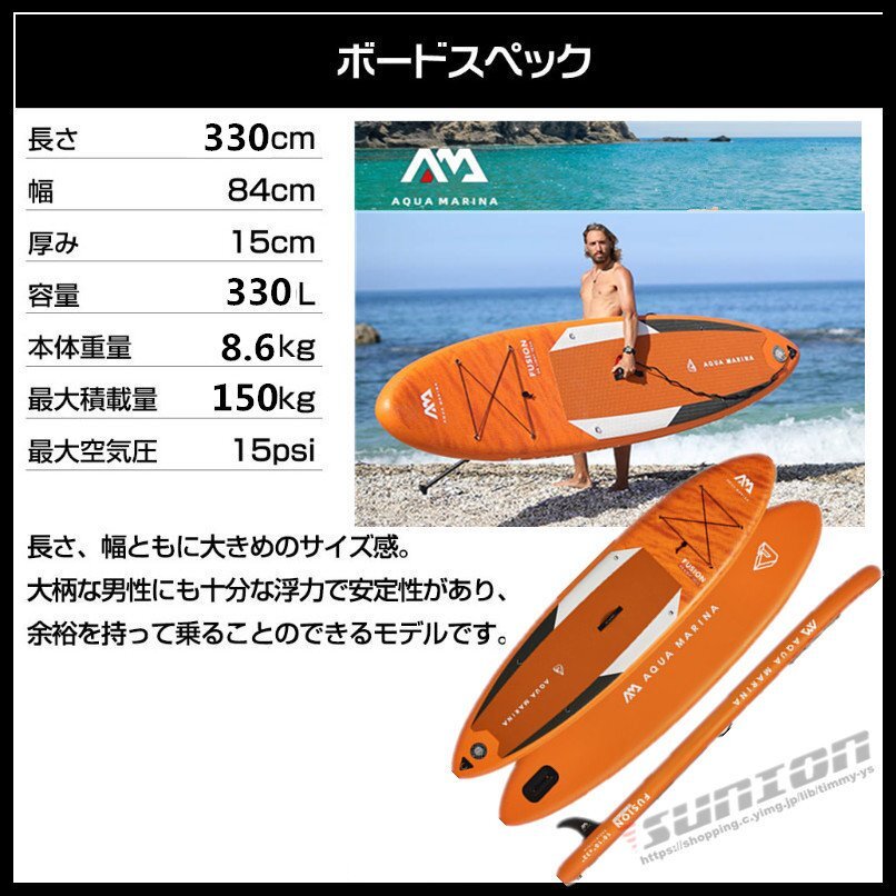 【商品特徴】■サーフィンや水上散歩などが楽しめるスタンドアップパドルボードです。■層構造で機械のみの加工ではなく、丁寧に一台ずつ手作業で立体に加工された本格SUPボード。■SUPを楽しみながら体幹トレーニングできます。■空気を入れて使用するインフレータブル式です。■使用後は空気を抜けるので収納は非常にコンパクトです。■荷物はゴムのバンジーコードでしっかり固定できます。■ボードが沖に流されないようにリーシュコードが付いています。【商品内容】:パドルボード本体/パドル/空気入れ/リペアキット/リーシュコード【素 材】:ドロップステッチ+ラミネートPVC ダブルレイヤー+EVAバッド【サイズ】:(約)330cm×84cm×15cm【重 量】:(約)8.6kg【積載重量】:(約)170kg【排水量】:(約)330L【最大空気圧】:15psi○使用上の注意事項○※改造/本来の目的以外/強い衝撃などはお控え下さい。※ 本製品を使用したことによる直接的&間接的に生じた事故、損害、破損についての責任は負いかねますので、ご注意ください。※こちらの商品は大型配送の為、返品対象外商品です。○以上を了承の上ご購入ください○