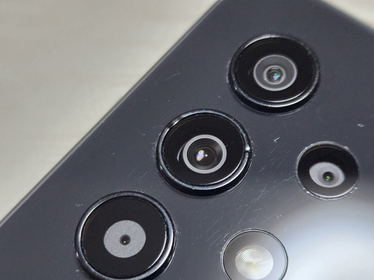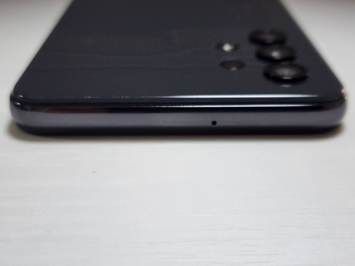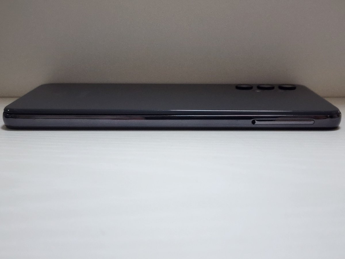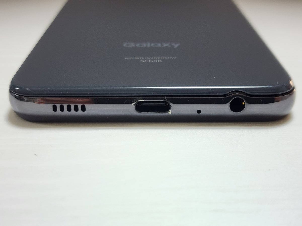 【外装状態】: C 画面に目立った傷はありません。側面は全体的にカバー痕や傷がついていて、コネクタまわりが塗装剥げしています。また、SIMトレーのピン穴が欠けていますが、トレーの出し入れは可能です。背面にもカバー痕や傷があり、経年劣化によりパネルが浮いています。また、アウトカメラの縁に打痕がついています。機能面は、画面に薄い焼けがあります。