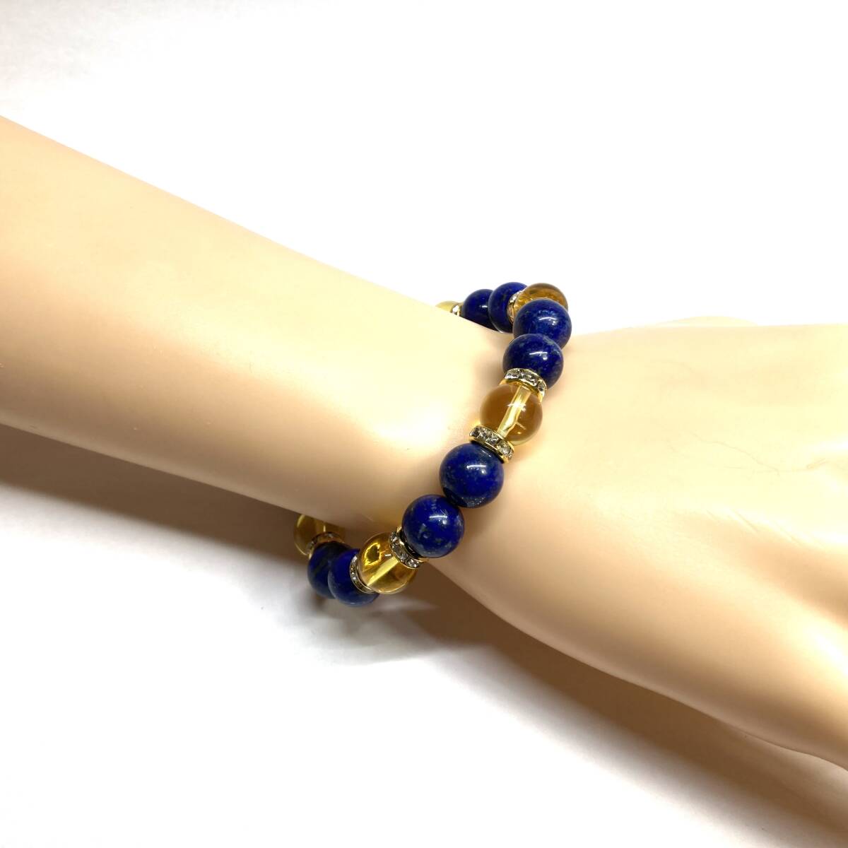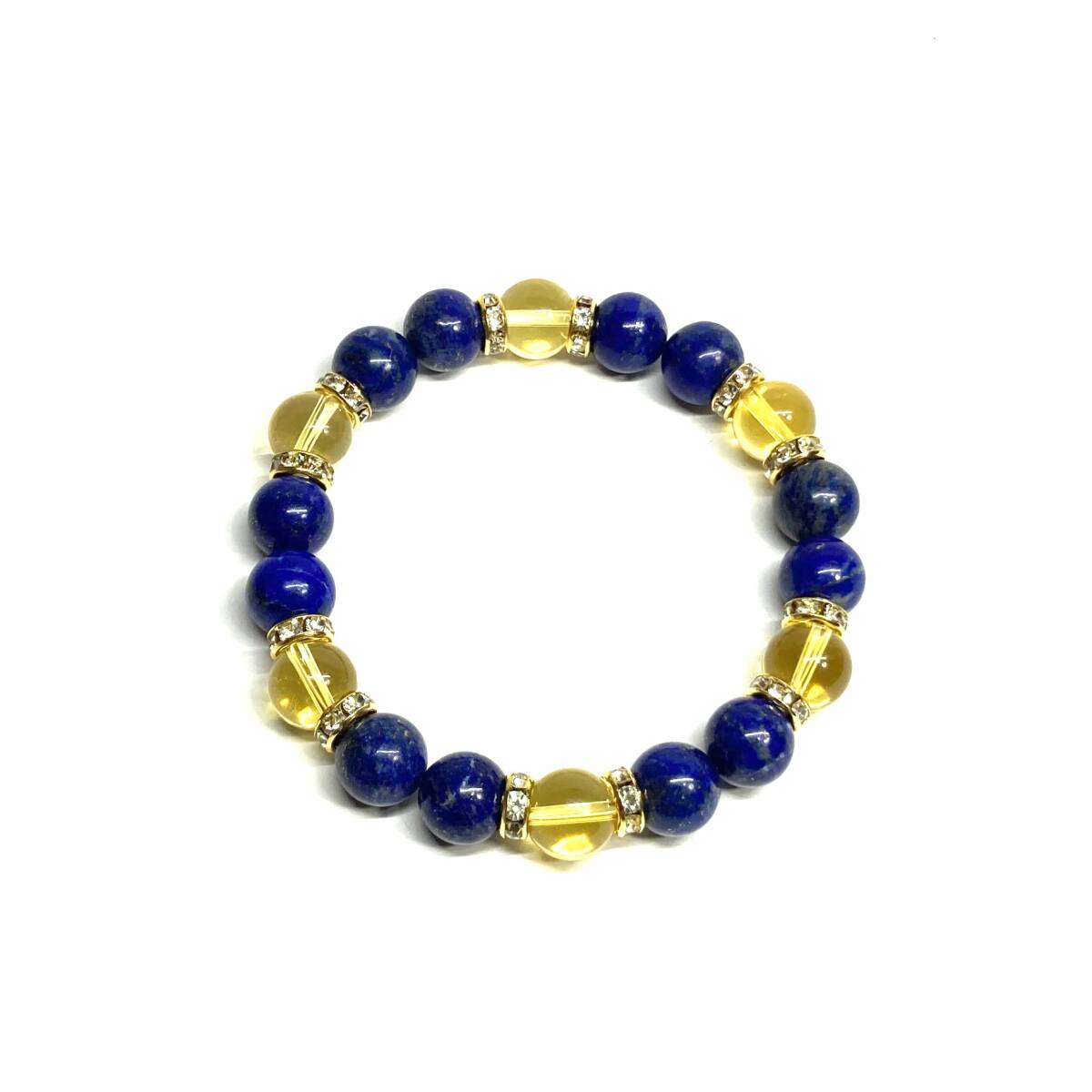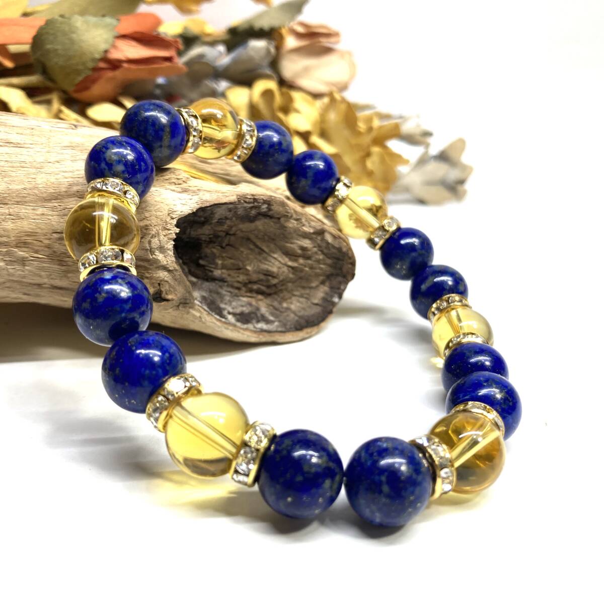 こちらは、ラピスラズリとシトリンを組み合わせたパワーストーンブレスレットです。間にはロンデルを挟み高級感あるデザインに仕上げております。石大きさは腕にも馴染みやすいように10mm玉で内径約18cm(伸可能)です。(サイズ変更の場合は取引ナビにてご連絡をお願いします。) 数に限りがございますので気になる方はお早めにどうぞ。