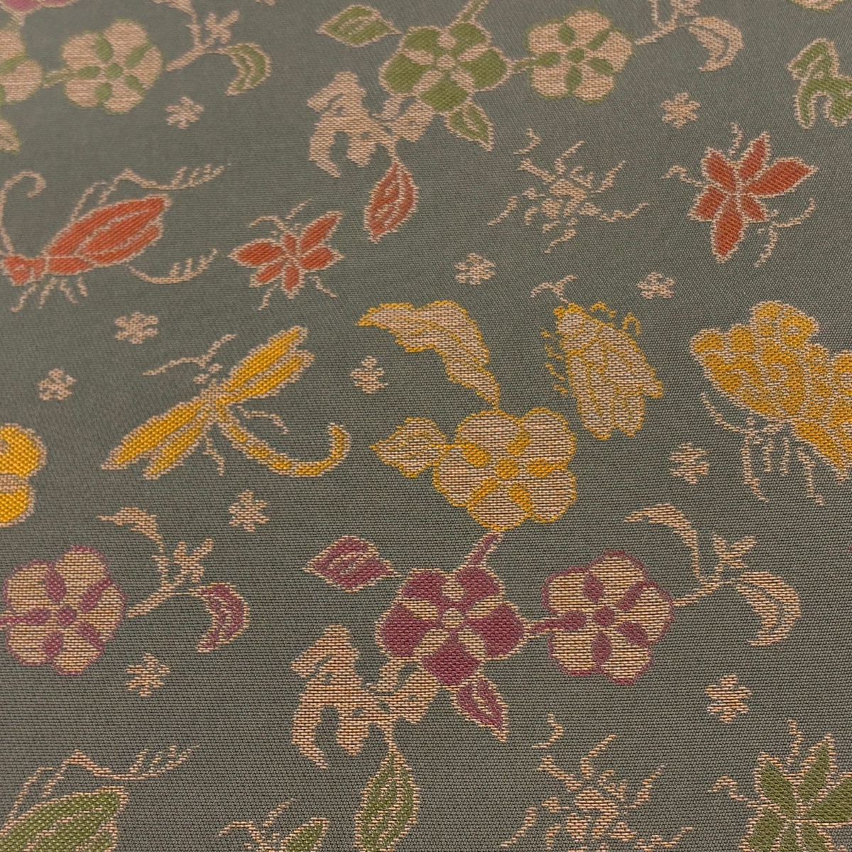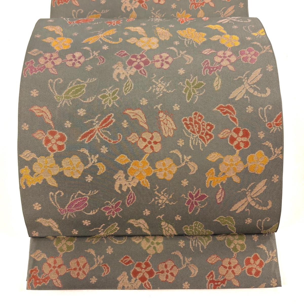 | 袋帯 秀品 落款 あらいそ 草花 昆虫 箔 灰緑 六通 正絹 【中古】 |