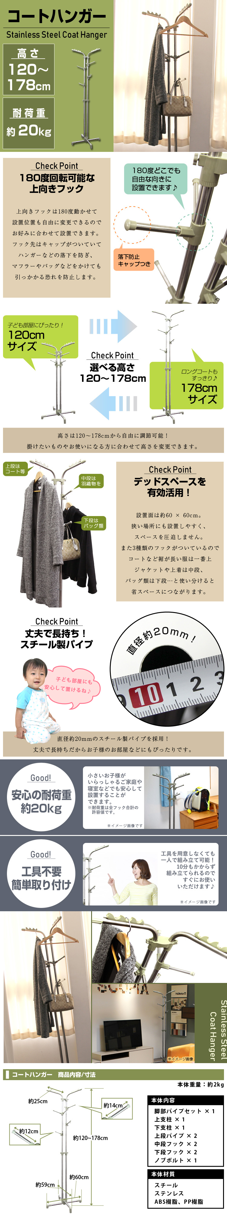 毎日使うバッグやジャケット、コート。「どうせ明日も使うから」なんてソファの上に置きっ放しになってませんか。 コートハンガーならスペースも取らず機能的に収納して頂けます!! 毎日使う物はサッと取れて、簡単に片付けられる収納がおすすめです♪ コートハンガーは10本のフックで収納力も抜群。 フックは180度動かせて設置位置も自由に変更できるのでお好みに合わせて設置できます! ついつい置きっぱなしのモノもすっきりとします。 高さは120cm~178cmまで自由に調整できます!! 【商品仕様】 サイズ(約):直径60cm×高さ120~178cm 重量(約):2kg 耐荷重(約):20kg ※全フックの合計の許容値 材質:スチール、ステンレス 他 【注意事項】 ※お客様組み立てとなります。 ※当商品設置に伴う損害(落下に起因する損害、壁の汚れ、壁の損傷等)に対する責任は負いかねます。 |