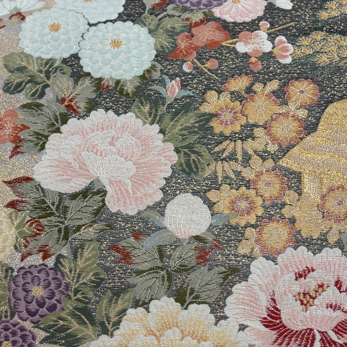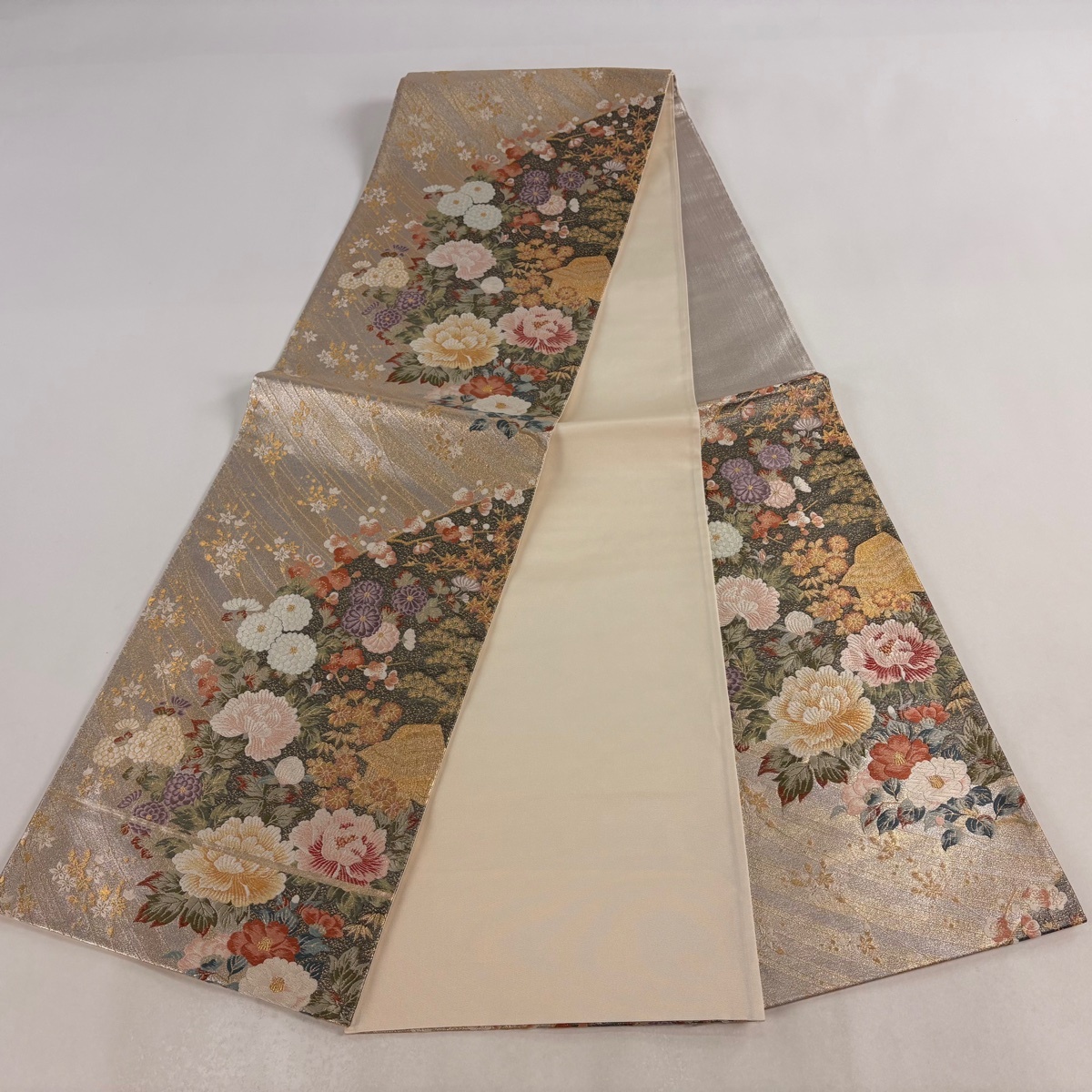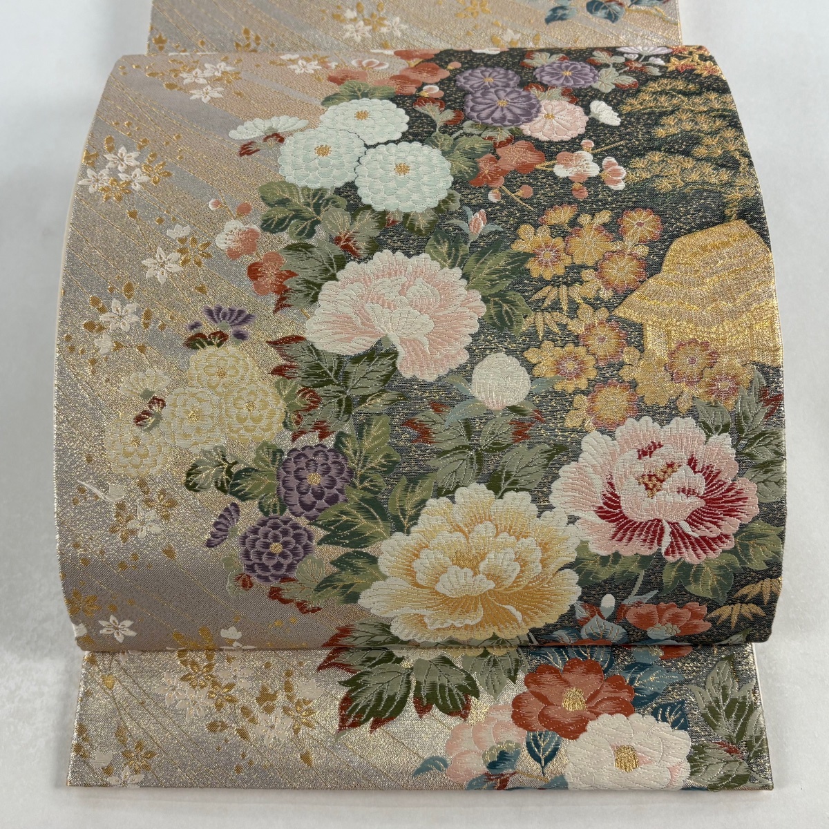 | 袋帯 秀品 家屋 草花 唐織 箔 金色 六通 正絹 【中古】 |