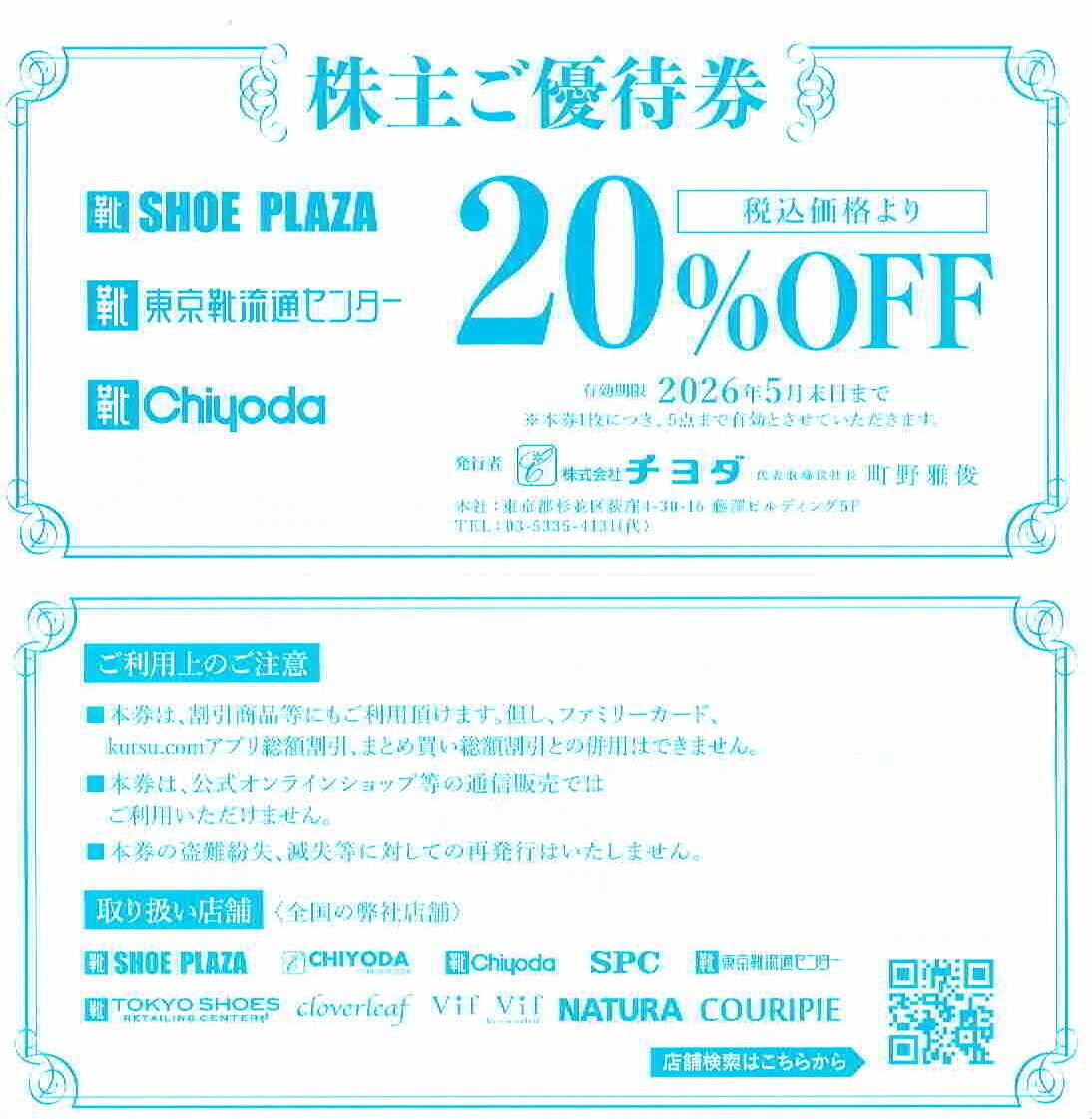 【 商品説明 】 チヨダの株主優待券です。 全国のSHOE-PLAZA、東京靴流通センター、チヨダ店舗にて、 お買い物の際に本券使用で20%offとなります。 在庫15あります。必要であればご相談ください。1枚あたりの値段です。