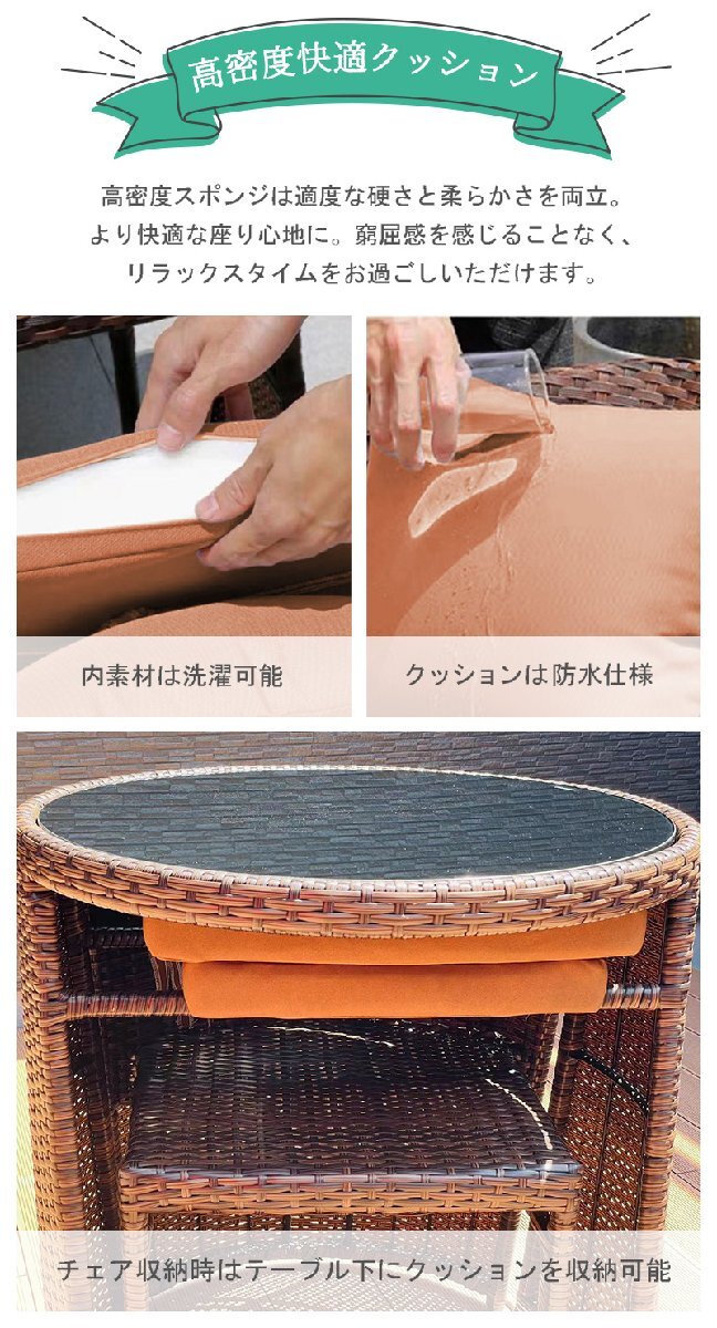■セット内容:丸形テーブル×1、チェア(一人掛け)×2、クッション[カラー:ブラウン](座、背)×2