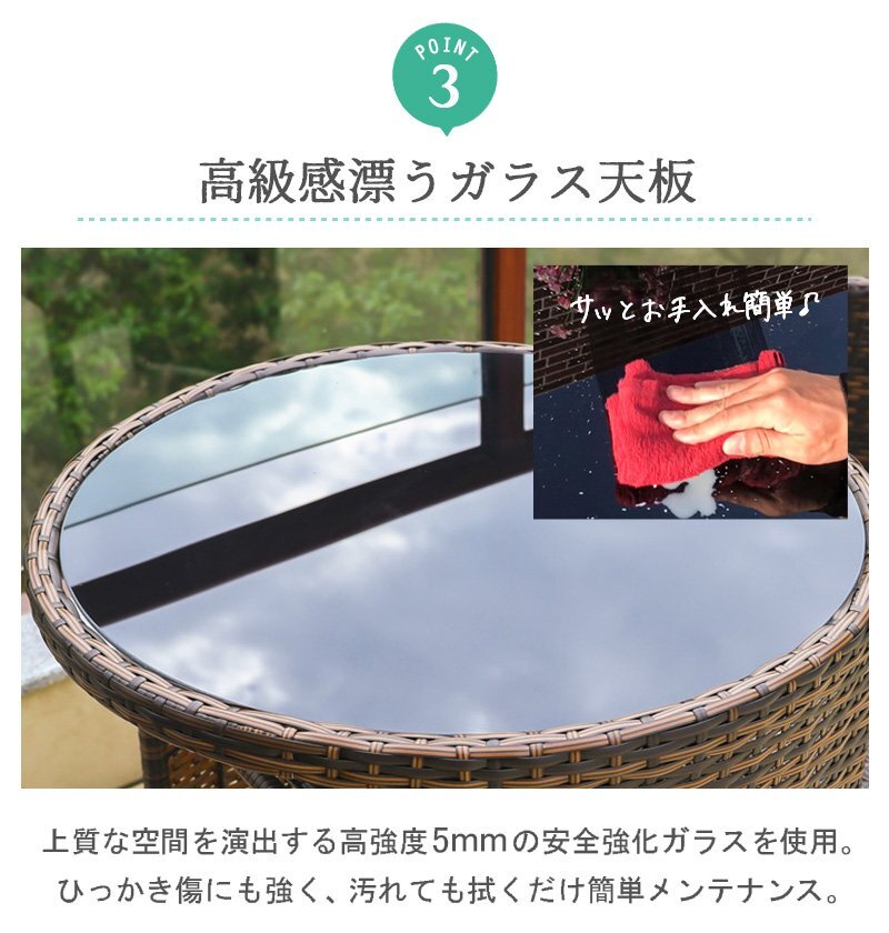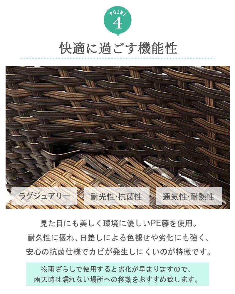ラタン調の合成樹脂なので、水濡れにも強く汚れてもさっと拭くだけお手入れが簡単なのもうれしいポイント