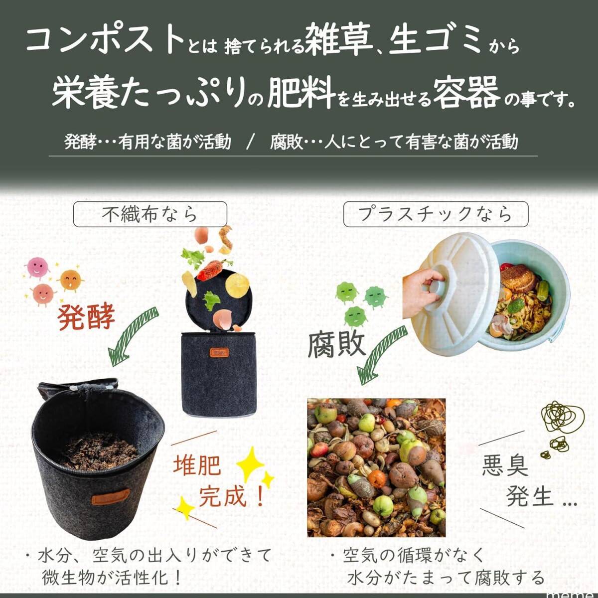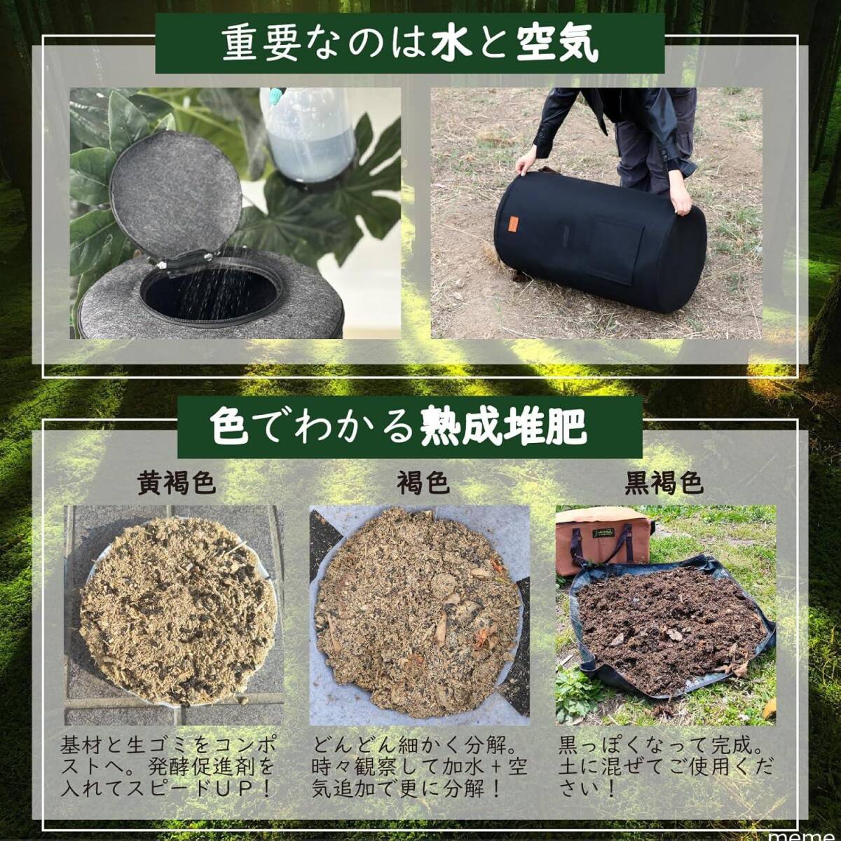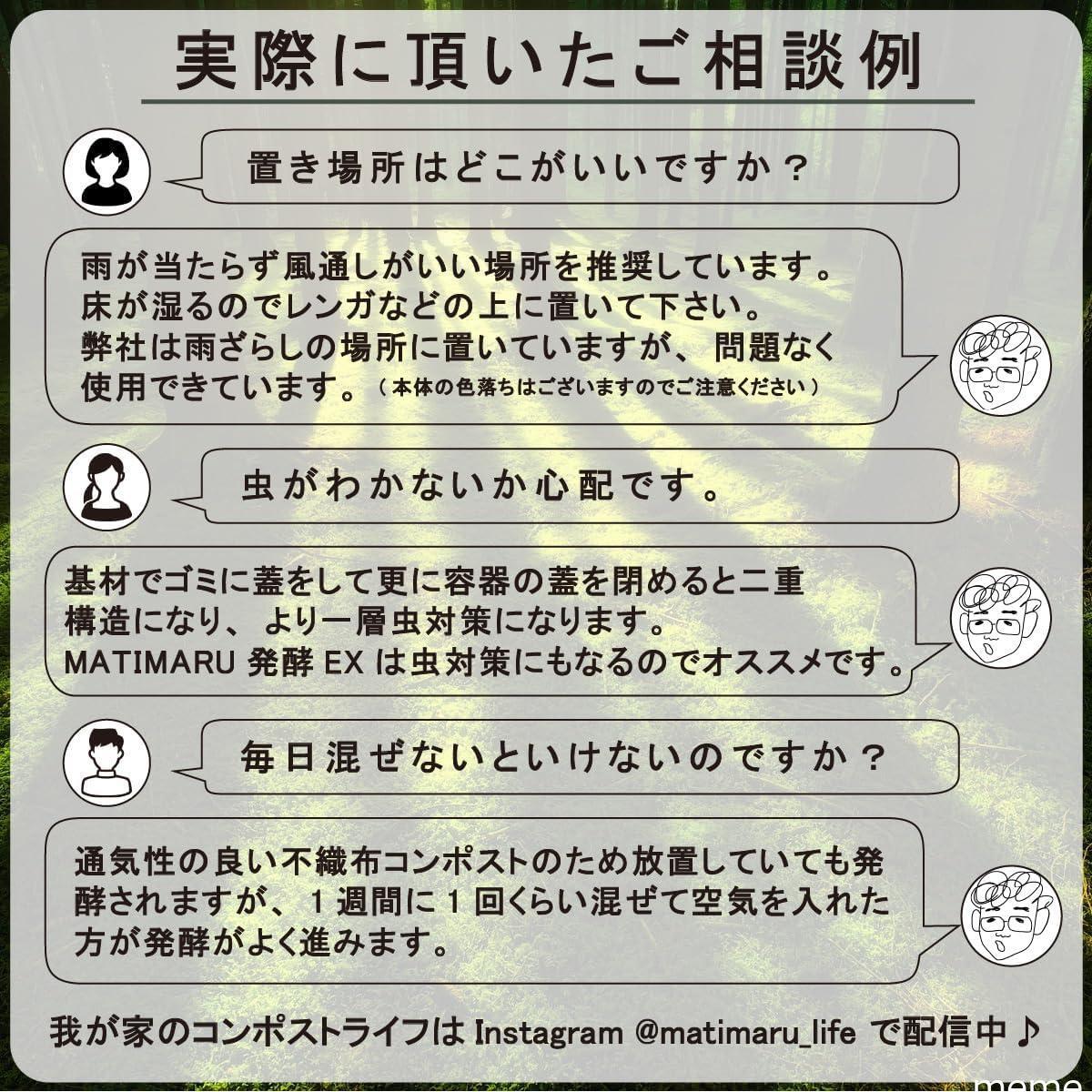 ■マティマルコンポストのひみつ 一般的なコンポストは密閉されていて腐敗しやすい傾向にありますが、**マティマルは「通気性の良い不織布」でできています。**余分な水分を外に出し、容器の無数の穴から微生物を取り込むことで、生ごみがスムーズに分解されます。 マティマルコンポストで、今日から環境にやさしい暮らしを始めませんか。