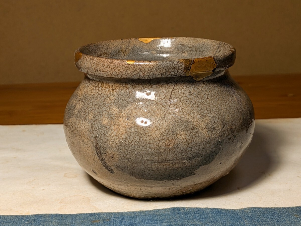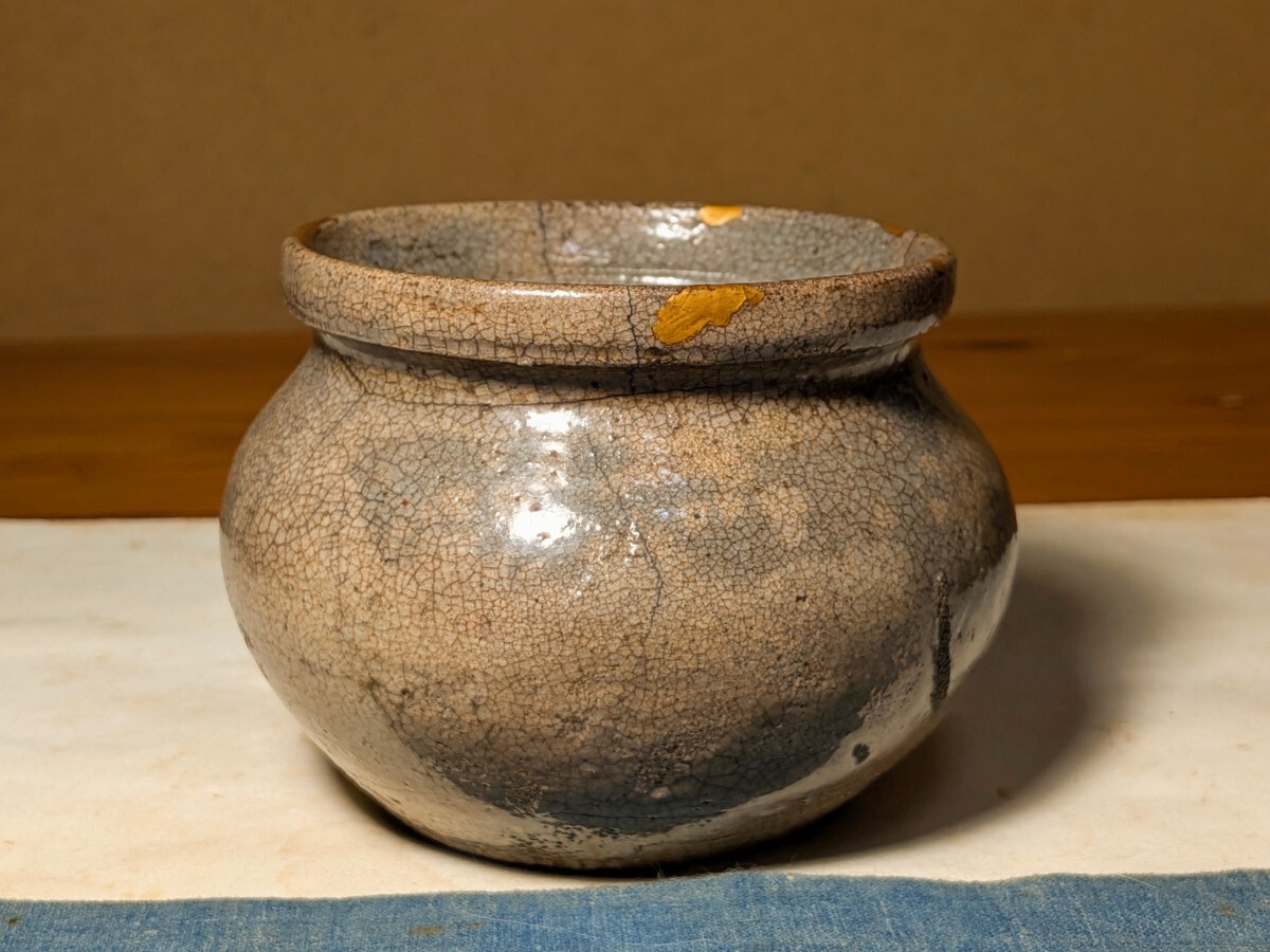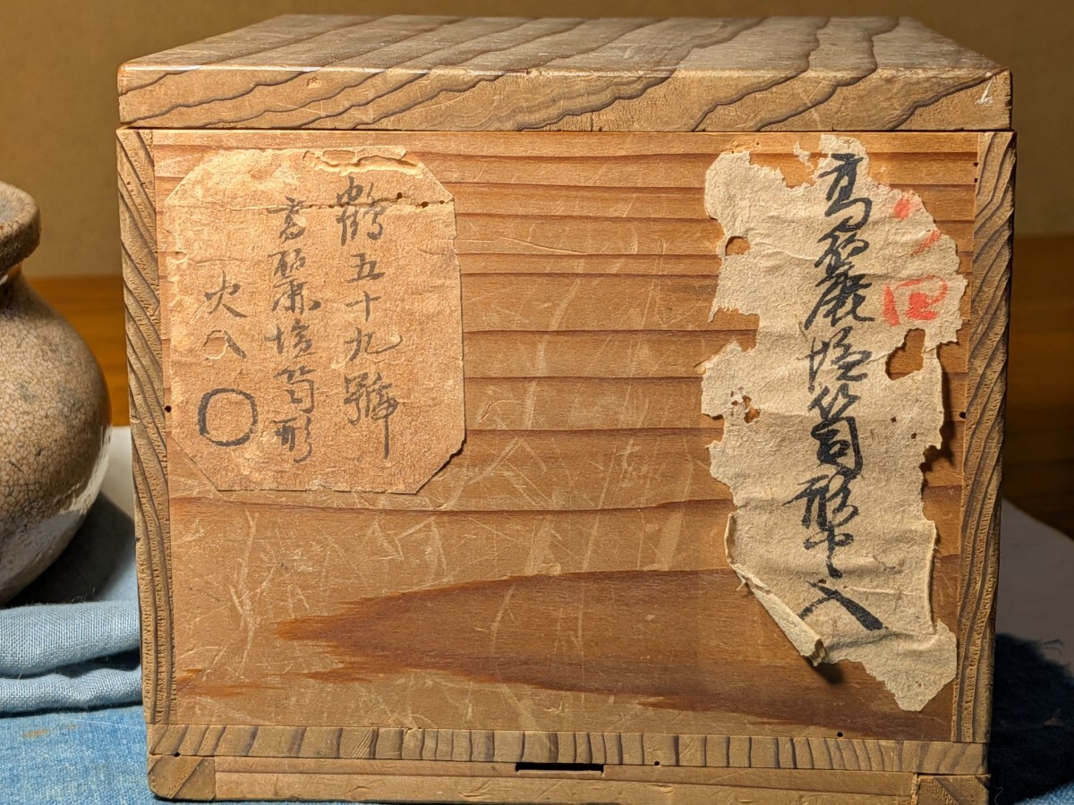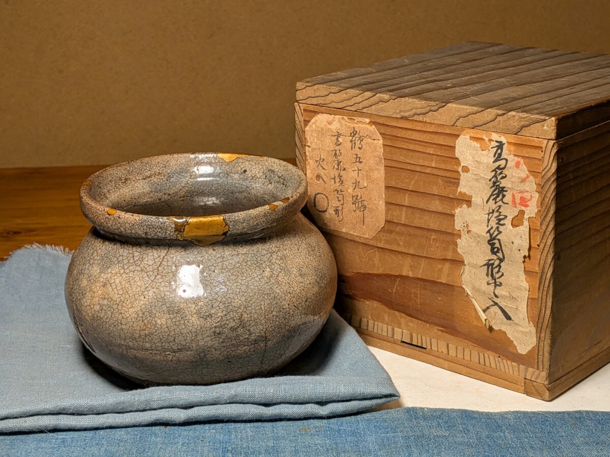 李朝の堅手の塩笥茶碗です。箱には高麗焼塩笥形火入と記されており火入として伝世した物のようです。火入で中に入っている灰が水分を吸うと少しずつ化学変化を起こしてこうした味わいになることがあるようです。口辺が広く内側が外反しているので塩笥茶碗として楽しめます。口辺にほつれの金直しが5か所、入が3か所、底部から腰にかけての鳥足が見られますが時間をかけてゆっくり入ったもので拡がる危うさは感じません。漏れもありません。これからの季節は特にご愛用いただける物と思います。時代杉箱あり。・口径8.8〜9センチ・高さ7.8〜8センチ・李朝中期 ※交換会と出張の関係で日曜終了の他に月曜終了でも優品を出品いたします。※新規の方、評価の悪い方の入札は取り消す場合があります。商品到着後は速やかに取引ナビの受取連絡を入れて下さい。