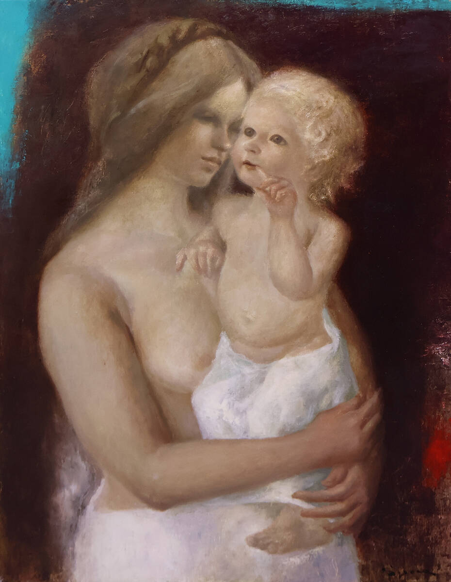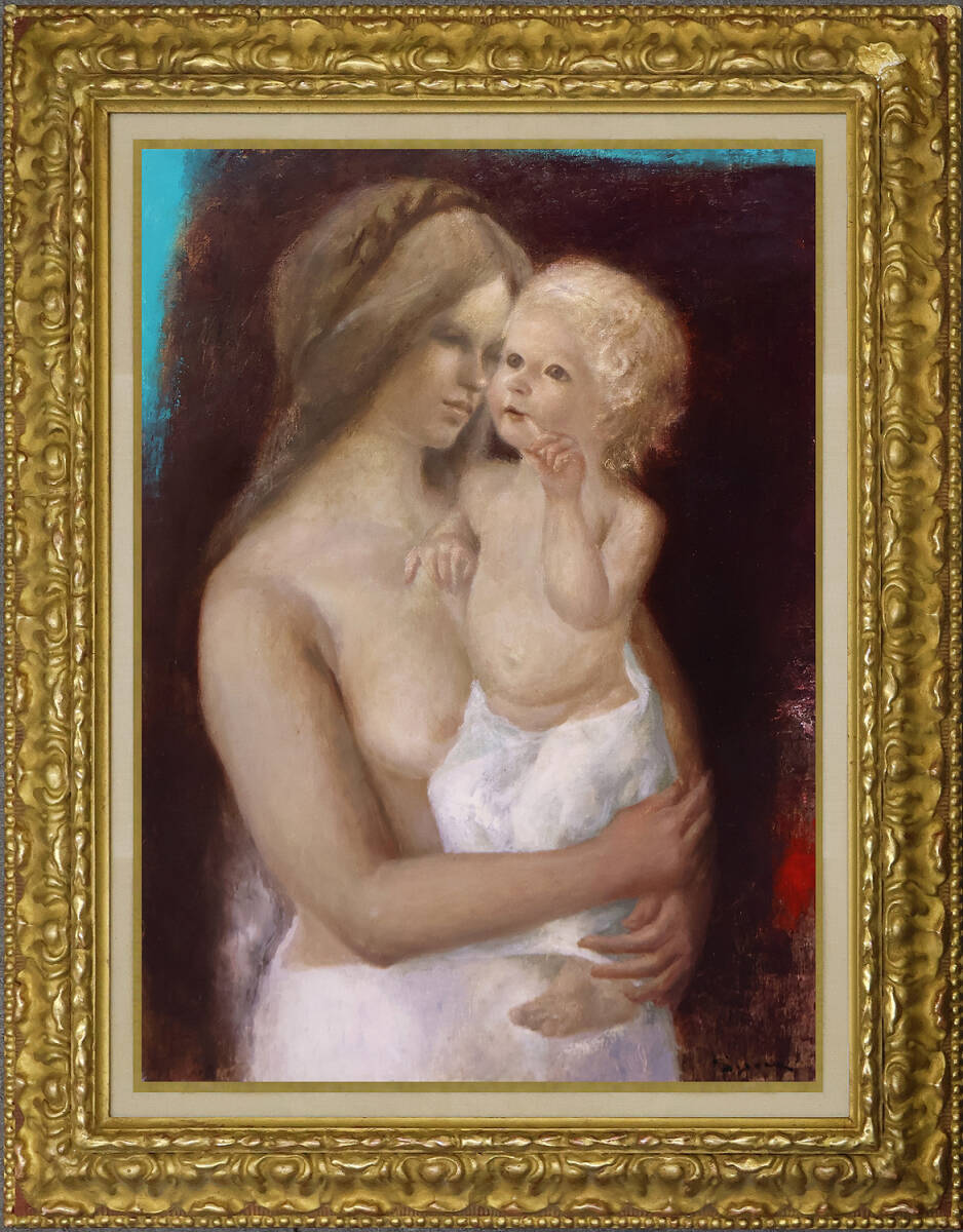 画家:芝田 米三 タイトル:母子像 技法:キャンバスに油彩 画面サイズ:P20号 額サイズ:94×75㎝ サイン:右下にサイン 裏にタイトル・サイン コンディション:概ね良好 芝田 米三 (しばた よねぞう) 1926年 京都府出身 1939年 京都商業学校入学 独立美術協会の今井憲一に油絵の指導を受ける 1945年 軍隊生活で中断していた絵の勉強を再開 独立美術京都研究所に入所し、須田国太郎に師事 1946年 独立展出品(以降ほぼ毎年出品) 1947年 独立展入選 1950年 独立展独立賞受賞 サロン・ド・プランタン賞受賞 1958年 独立展会員に推挙 日本国際美術展招待出品 1961年 個展開催(銀座・サヱグサ画廊、以降多数開催) 1963年 安井賞展安井賞受賞 東京国立近代美術館に作品買上げ 1965年 ヨーロッパ取材旅行 1966年 独立展G賞受賞 1968年 芝田米三、彼末宏、島田章三 三人展(サヱグサ画廊) 京都現代美術秀作展選出 1971年 渡欧(同73年) 1974年 安井賞選考委員に就任 日伯美術連盟評議員に就任 1975年 サンパウロ州議会より騎士賞授与 1978年 京都府芸術会館理事に就任 1979年 ソビエト文化省に招待される 1980年 回顧展開催「生命賛歌」(日本橋・大阪高島屋) 『芝田米三画集1942~1980』刊行(求龍堂) 1981年 海外個展開催(パリ/ベルネームジュンギャラリー、 バルセロナ/ゴズランドギャラリー) 1982年 日本の絵画寄贈のためにリオデジャネイロ近代美術館へ角浩とともに派遣 芝田米三、角浩、浮田克躬三人展開催(東武百貨店) 1983年 個展開催(梅田大丸ミュージアム) 1984年 個展開催「生命の讃歌」(伊勢丹美術館) 1986年 個展開催(京都府立芸術文化会館) 1989年 「婦人公論」表紙絵の原画展開催(東京・大阪三越) 京都府文化功労賞受賞 1993年 独立美術協会功労賞受賞 1994年 京都市文化功労賞受賞 日本芸術院賞受賞 日本芸術院会員に任命 1998年 「風景と自然・国立公園の絵画展」出品(小杉放菴記念日光美術館) 個展開催「群像の風景展」(京都市美術館) 1999年 勲三等瑞宝章受章 2000年 個展開催「命の星燦々」(日本橋三越、大阪大丸、他巡回、~'01年) 「花と緑の名品展」出品(石川県立美術館) 2002年 個展開催「永遠なる音の翼」(高島屋各店巡回) 金沢美術工芸大学教授退任 2003年 独立美術協会70回記念展出品(大阪高島屋) 京都市美術館開館70年記念展出品 作品展「京都・洋画の現在」出品(京都文化博物館) 日本秀作美術展出品(なんば高島屋) 2006年 21世紀展出品 没(享年79歳) 所蔵/東京国立近代美術館、京都国立近代美術館、サンパウロ美術館、 リオデジャネイロ近代美術館、京都府立京都文化博物館、愛知県美術館、 京都市美術館、名古屋市美術館、秋田市立千秋美術館、佐久市近代美術館、 山形美術館、彫刻の森美術館、神宮美術館、メナード美術館、MOA美術館、 外務省、他 |