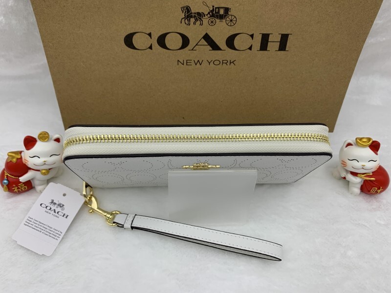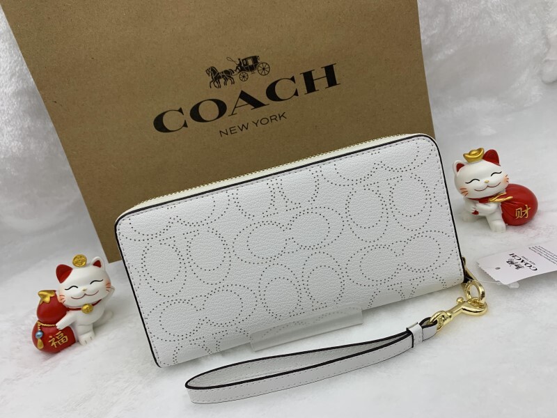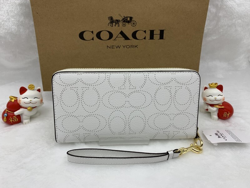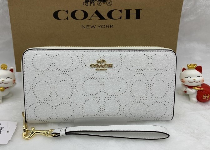ホワイトの無地レザーにシグネチャー総柄がパンチング加工されたラウンドファスナー長財布です。